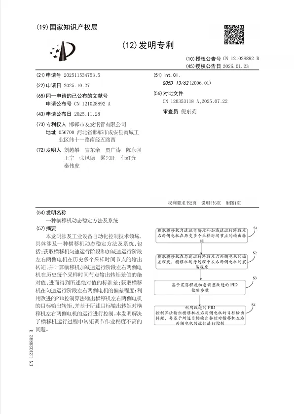 在现代化生产及自动化物流系统中,横移机作为一种常见的搬运与输送设备,被 广泛应用于仓储、车间、轨道运输及重载搬运等场景。横移机通常通过布置在其两侧的驱动 电机实现同步驱动,以保证设备在运行过程中能够沿既定轨迹平稳移动。由于横移机的工 作环境复杂,其运行状态不仅受到设备自身结构特性的影响,还会受到负载变化、摩擦力差 异、外部冲击以及轨道平整度等多种因素的干扰。在这种情况下,若左右电机输出转矩不同 步,容易造成横移机运行过程中的偏移、振动乃至结构冲击,这不仅会降低设备的运行平稳 性和作业精度,还可能加剧机械部件的磨损,缩短设备的使用寿命。 为了提升横移机的动态稳定性能,现有控制系统普遍采用PID控制算法来实现电 机输出的调节。PID控制因其结构简单、实现方便、参数直观,已在工业自动化领域得到广泛 应用。 然而,在横移机这一类对动态稳定性要求较高的场景中,传统PID算法的不足也逐 渐显现。首先,传统PID参数通常在系统设计或初始调试阶段通过经验法、试凑法或 Ziegler‑Nichols法等方式设定为固定值,而横移机在匀速运行阶段与加减速运行阶段,其 动态特性存在显著差异:在匀速阶段,电机转矩变化相对平缓,系统对扰动的敏感性较低; 但在加减速阶段,电机需要快速响应负载变化,转矩波动显著增强,此时固定的PID参数往 往难以兼顾快速性与稳定性,容易导致调节过度或响应迟滞,从而导致横移机运行过程中 转矩调节作业精度不高的问题。 本发明涉及工业设备自动化控制技术领域, 具体涉及一种横移机动态稳定方法及系统,包 括:获取横移机匀速运行阶段和加减速运行阶段 左右两侧电机在历史多个采样时间节点的输出 转矩,并计算横移机加减速运行阶段左右两侧电 机在历史每个采样时间节点输出转矩差值的绝 对值,进而得到所述绝对值的标准差;获取横移 机在匀速运行阶段左右两侧电机的偏差程度;利 用改进的PID控制算法输出横移机左右两侧电机 的目标输出转矩,并基于所述目标输出转矩对横 移机左右两侧电机的运行进行控制。本发明解决 了横移机运行过程中转矩调节作业精度不高的 问题。(特别注意:任何单位或者个人未经专利权人许可,都不得实施其专利,即不得为生产经营目的制造、使用、许诺销售、销售、进口其专利产品,或者使用其专利方法以及使用、许诺销售、销售、进口依照该专利方法直接获得的产品。)