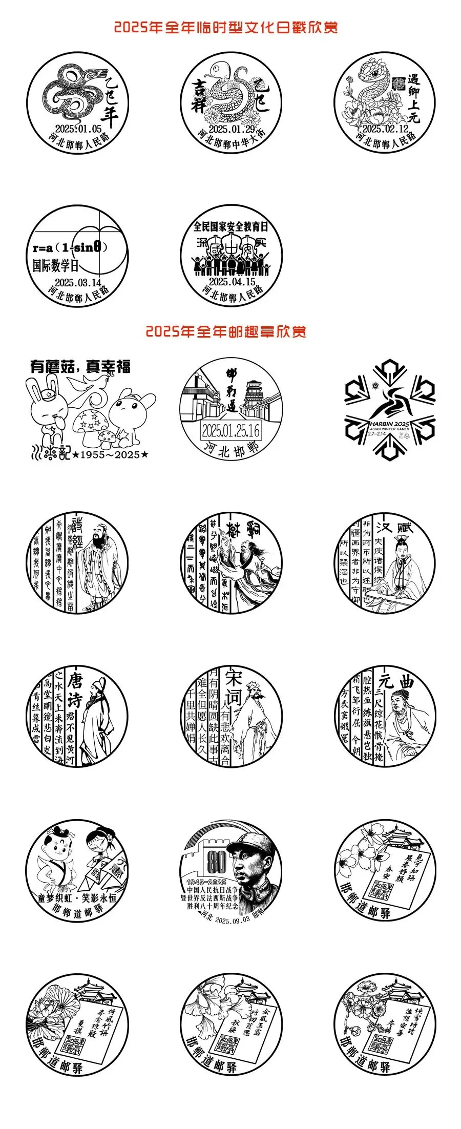 2025年,中国邮政集团有限公司邯郸市分公司邮政邮政业务部报备启用临时型文化日戳5枚,免费发布邮趣章15枚,如上。
