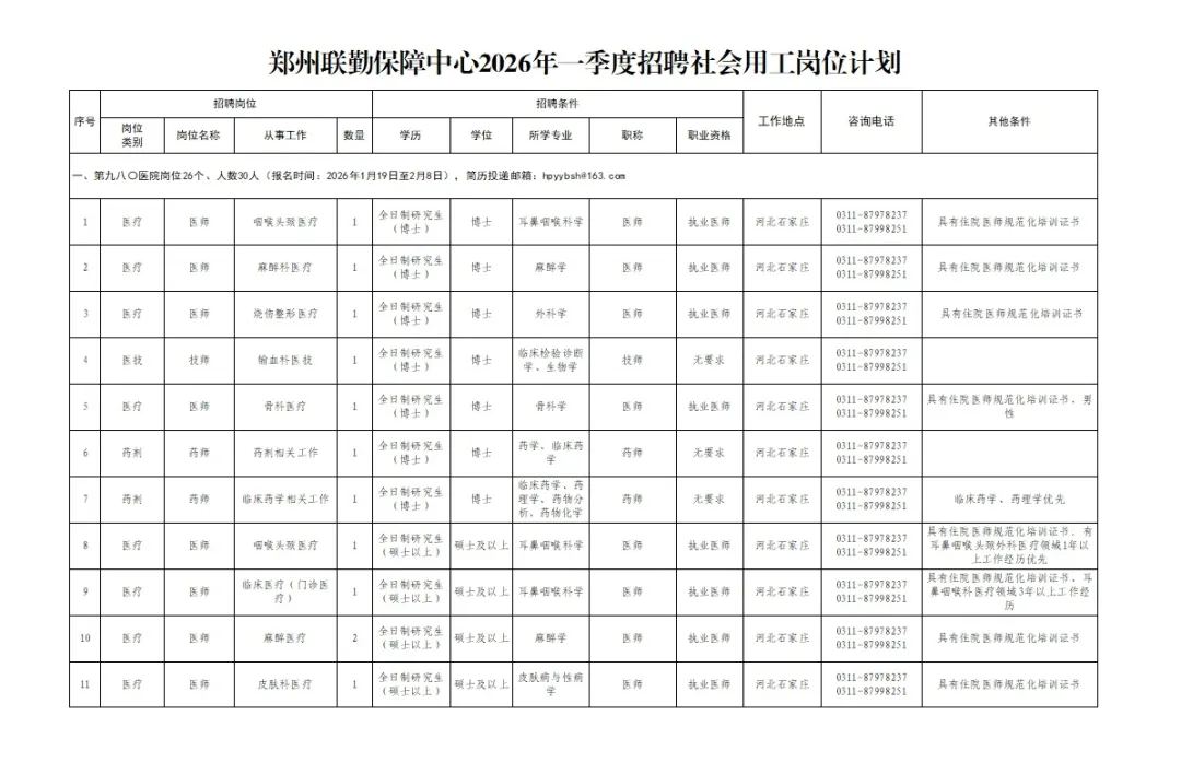 根据上级统一部署,联勤保障部队第980医院2026年第一季度拟招聘岗位26个、人数30人,具体岗位信息请点击下方图片扫码查看。(附岗位表)
