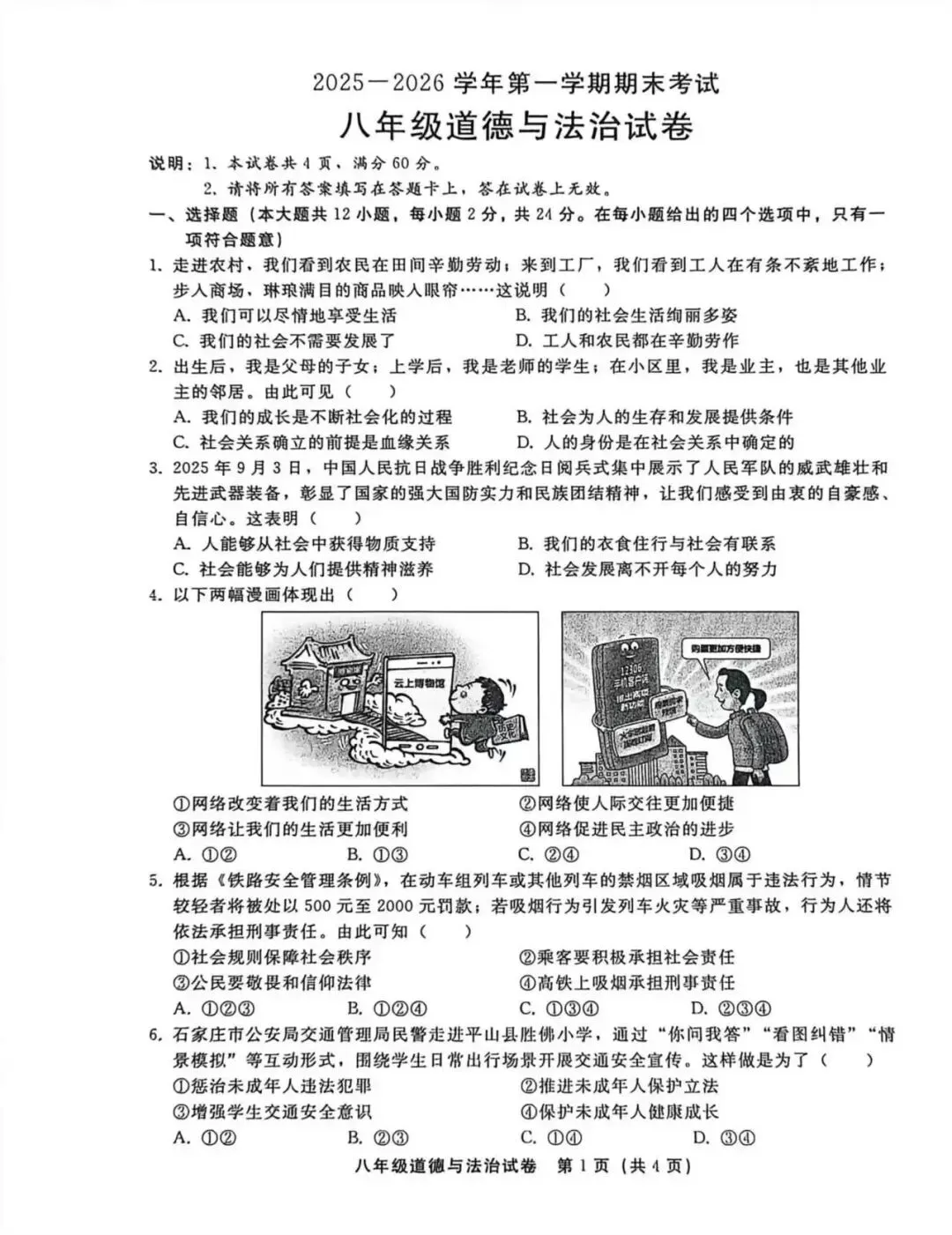 >2026年1月邢台市八年级上期末考试道法试卷(含答案)