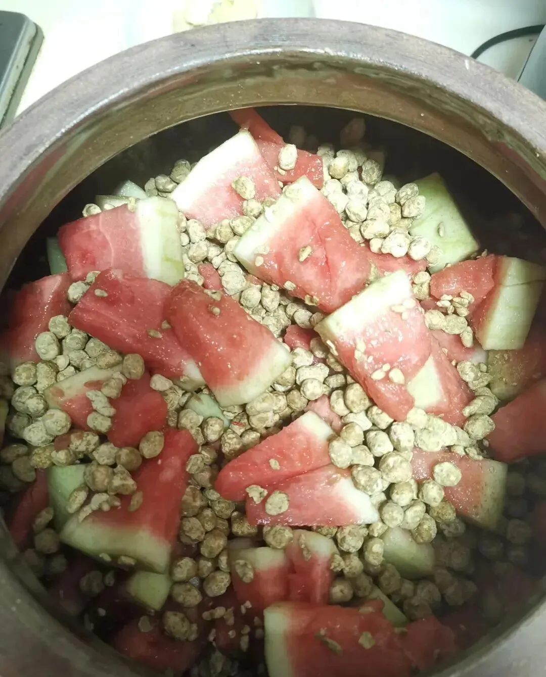 说实话 , 活了这么多年 , 头一回听说这东西。 据说是把西瓜果肉和发酵黄豆、盐混在一起 , 捂上一个月就成了 , 邢台那边好多人家里都会做。