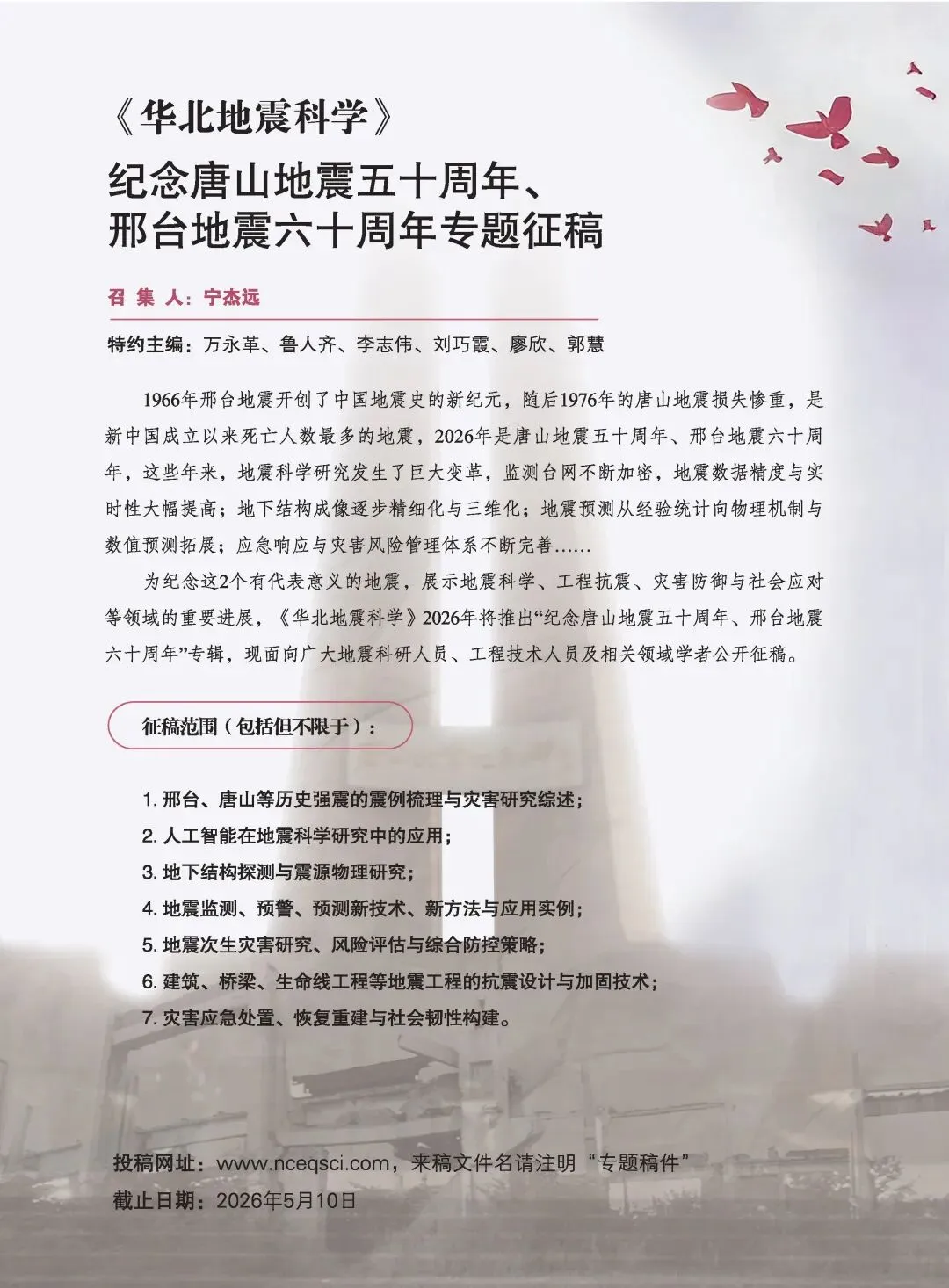 《华北地震科学》纪念唐山地震五十周年、邢台地震六十周年专题征稿