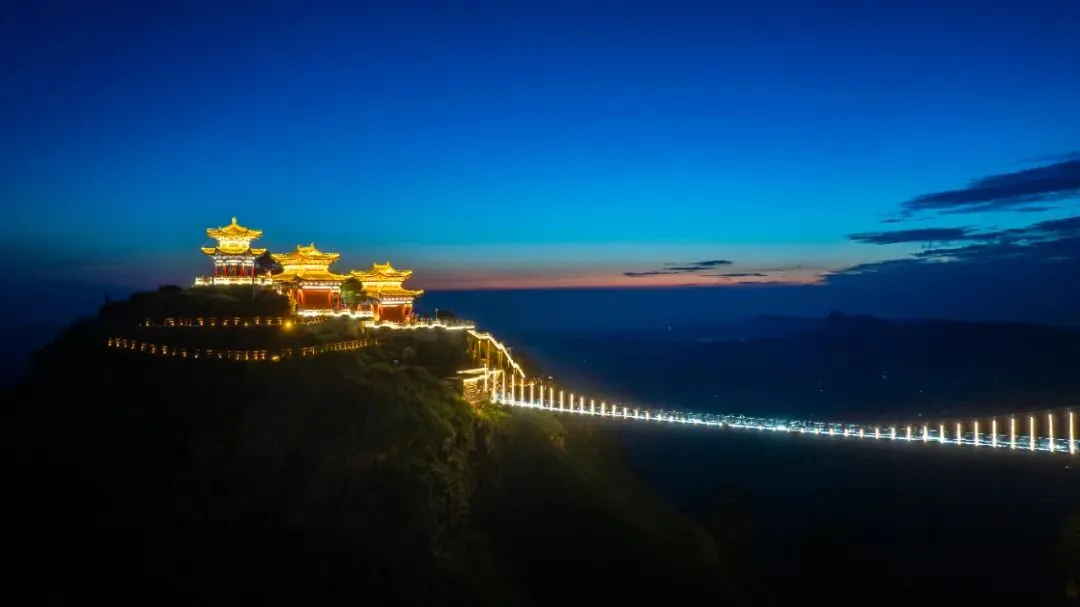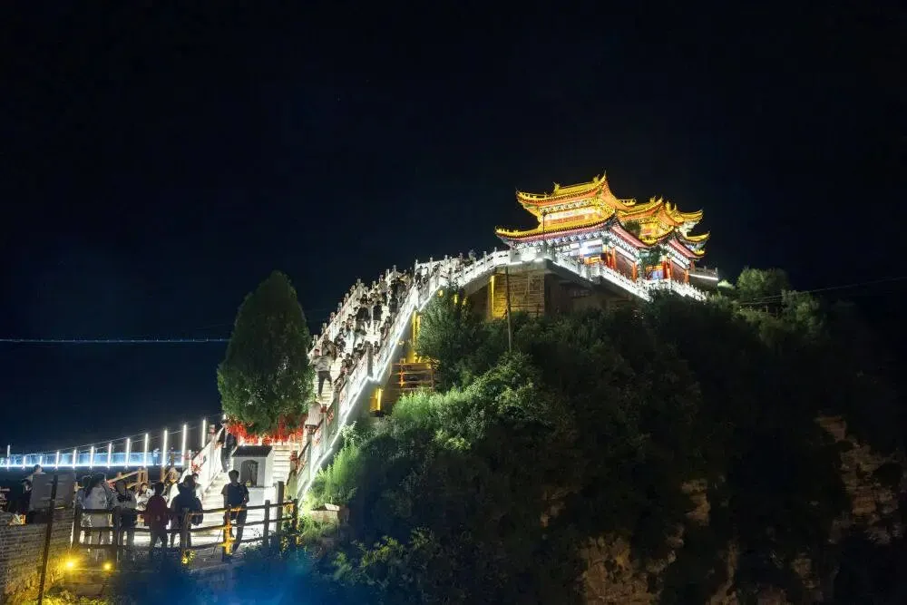 夜幕降临,在太行山深处的古武当山景区里,蜿蜒的山路和山顶古建筑依次被点亮,空灵优美的音乐配合高低错落的灯光,给游客带来了奇妙的爬山体验,这是该景区国庆假期热门的“夜爬”项目。