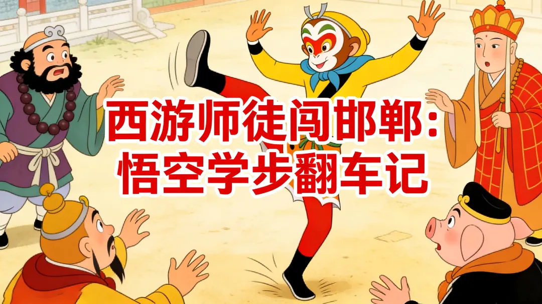 可谁曾想,这悟空平日里翻跟头、驾云样样精通,走起邯郸步来却洋相百出。他学着老人的稳重步伐,迈一步晃三晃,差点摔个狗啃泥;学着姑娘的轻盈姿态,扭扭捏捏,活像个跳大神的;学着小孩的活泼模样,蹦蹦跳跳,反倒踩坏了人家的菜摊子。摊主拉住他不依不饶,悟空急得抓耳挠腮,掏出金箍棒就要耍横,唐僧急忙赶过来,念起了紧箍咒:“悟空!休得无礼!邯郸乃礼仪之邦,你这般鲁莽,岂不是丢了咱们取经团队的脸?”