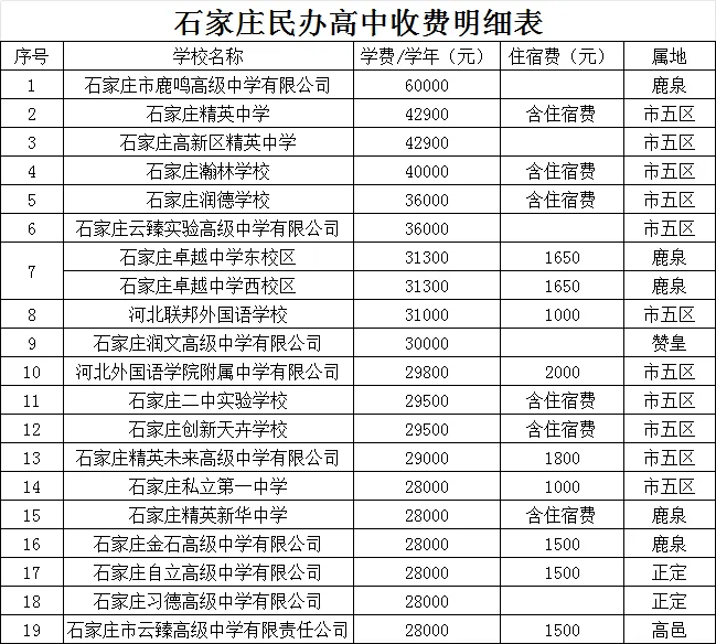 石家庄市鹿鸣高级中学60000,石家庄精英中学42900,