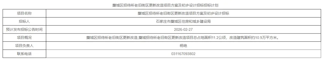 近日,石家庄公共资源交易网发布藁城区招待所老旧街区更新改造项目方案及初步设计招标招标计划。