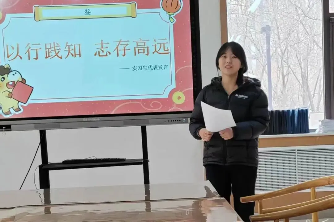 实习生代表上台发言,言语间满是感恩与不舍。宋超涵分享了自己从校园走向讲台的蜕变历程,感谢学校提供的宝贵实习机会,感谢程校长、张主任以及各位指导老师的悉心教导与无私帮助。从教案撰写到课堂把控,从班级管理到家校沟通,正是老师们的倾囊相授,让大家快速褪去学生的稚气,逐步掌握教学技能,坚定了投身教育事业的决心。同时,也表达了对学校的美好祝愿,愿瀚唐和雅小学桃李芬芳,蒸蒸日上。