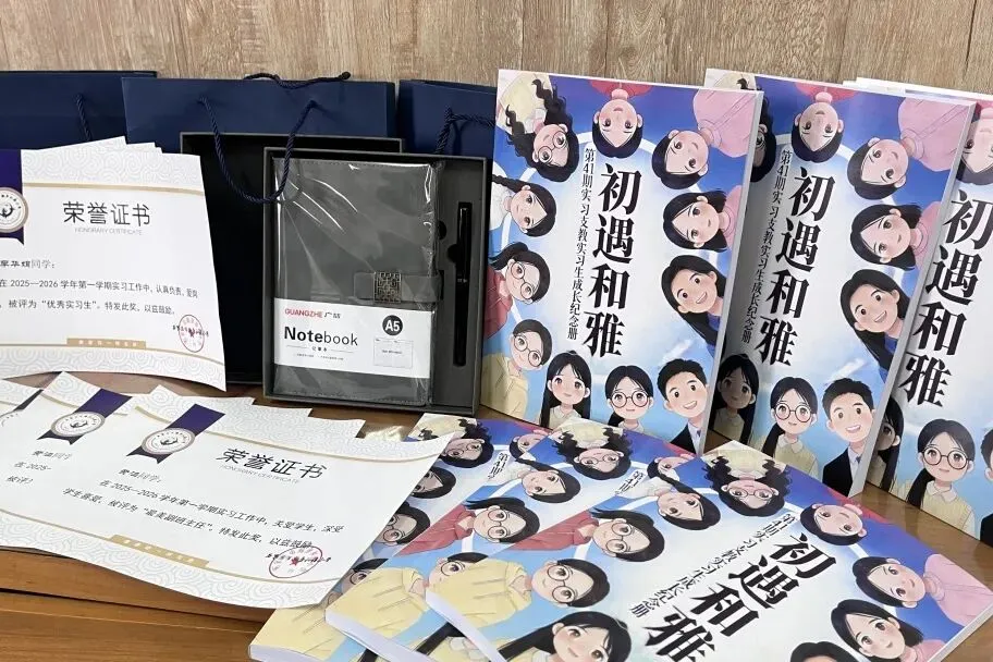 最令人动容的环节莫过于纪念册颁发。程校长与张主任亲手将制作精美的纪念册送到每位实习生手中,纪念册里收录了实习期间的精彩瞬间与领导、老师们的殷切寄语,既是对这段时光的美好定格,也是对实习生们的深切祝福。接过纪念册的那一刻,不少实习生眼眶湿润,这份沉甸甸的礼物,承载着学校的认可与期许,将成为他们未来前行路上的温暖动力。