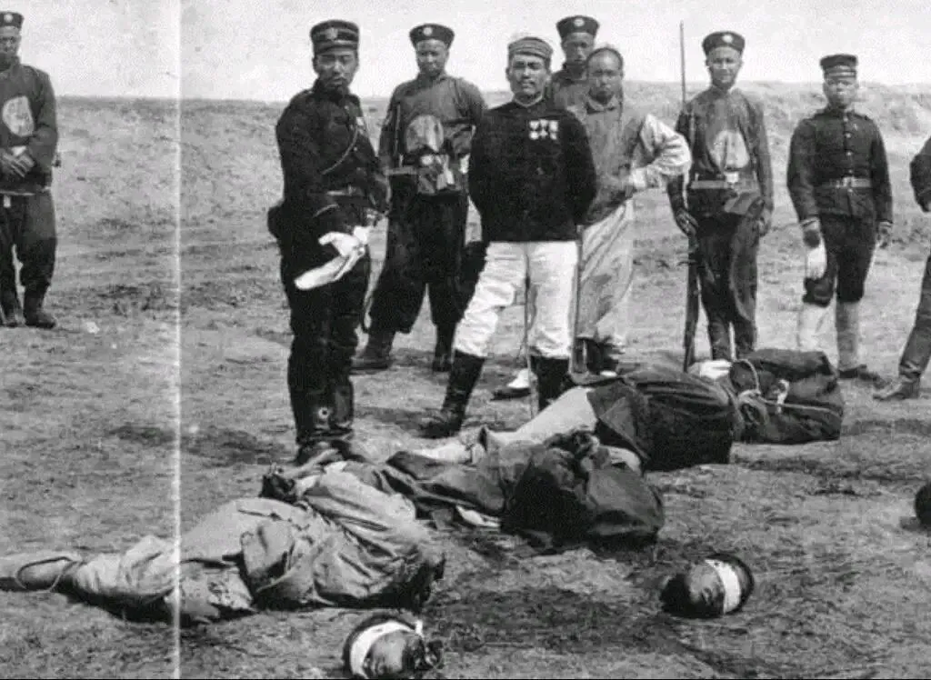 图为义和团成员的人被日军砍下,清的士兵麻木的站在旁边,仿佛被杀害的不是他们的同胞。