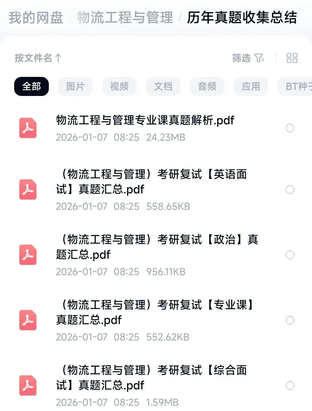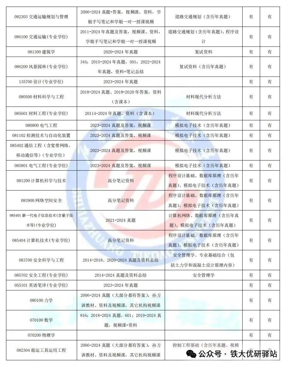MBA复试、 MEM复试、 物流工程与管理、 风景园林、 C程序设计、 安全管理学、 材料现代分析方法、 电气专业复试、 混凝土复试、 计算机网络复试、 机械工程控制基础、 机械制造技术基础、 数理复试、 铁道工程复试、 土力学复试、 建筑学、 交通运输复试资料(道路交通规划)、 马克思主义(毛泽东思想基本原理)、 模电复试资料、 数据库原理等,