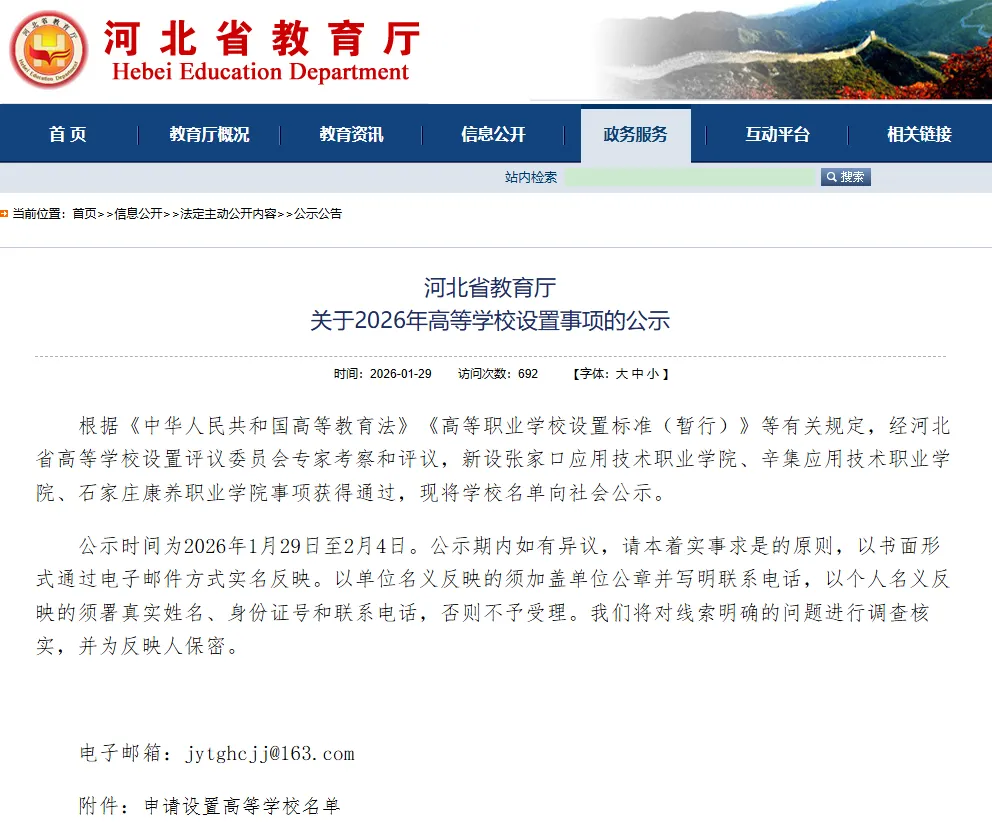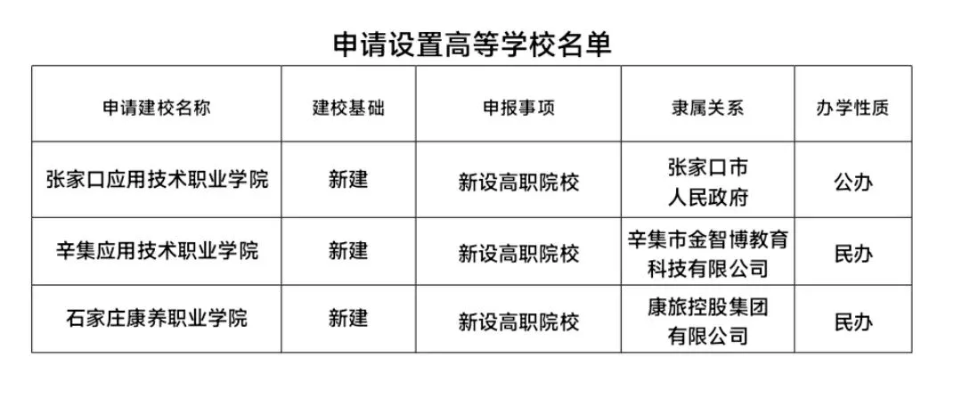 根据《中华人民共和国高等教育法》《高等职业学校设置标准(暂行)》等有关规定,经河北省高等学校设置评议委员会专家考察和评议,新设张家口应用技术职业学院、辛集应用技术职业学院、石家庄康养职业学院事项获得通过,现将学校名单向社会公示。