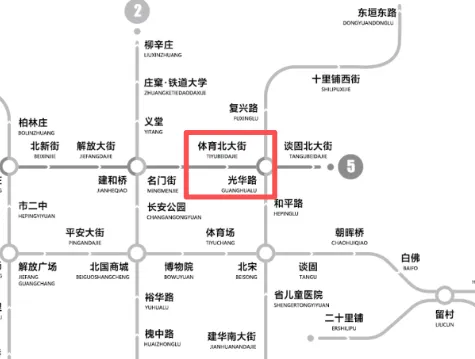 光华路站位于建华大街与光华路交叉口处,是4号线与5号线的换乘车站。其中,4号线沿建华大街敷设,5号线沿光华路敷设。光华路站(5号线)为地下三层岛式车站,设有3个出入口、2个消防出入口以及3组风亭。