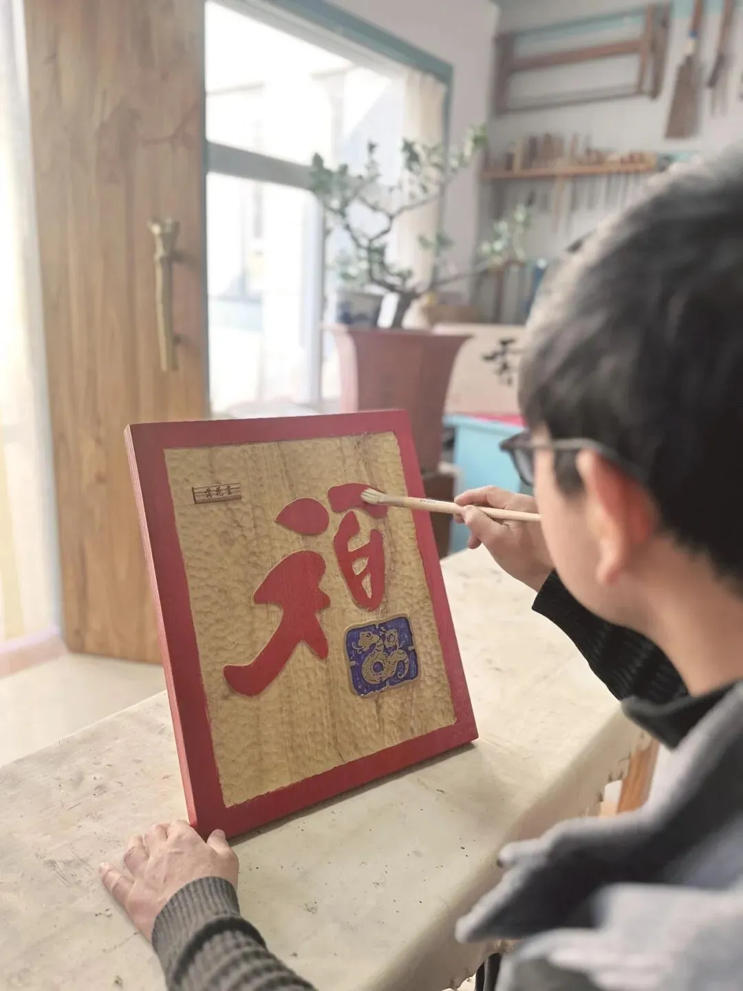 木板上雕刻红色的“福”字,字中右下角的“田”保留了外框,框内留白处以靛蓝色铺满,中间精心雕刻了一条金色卡通小蛇,蛇身刻有祥纹……