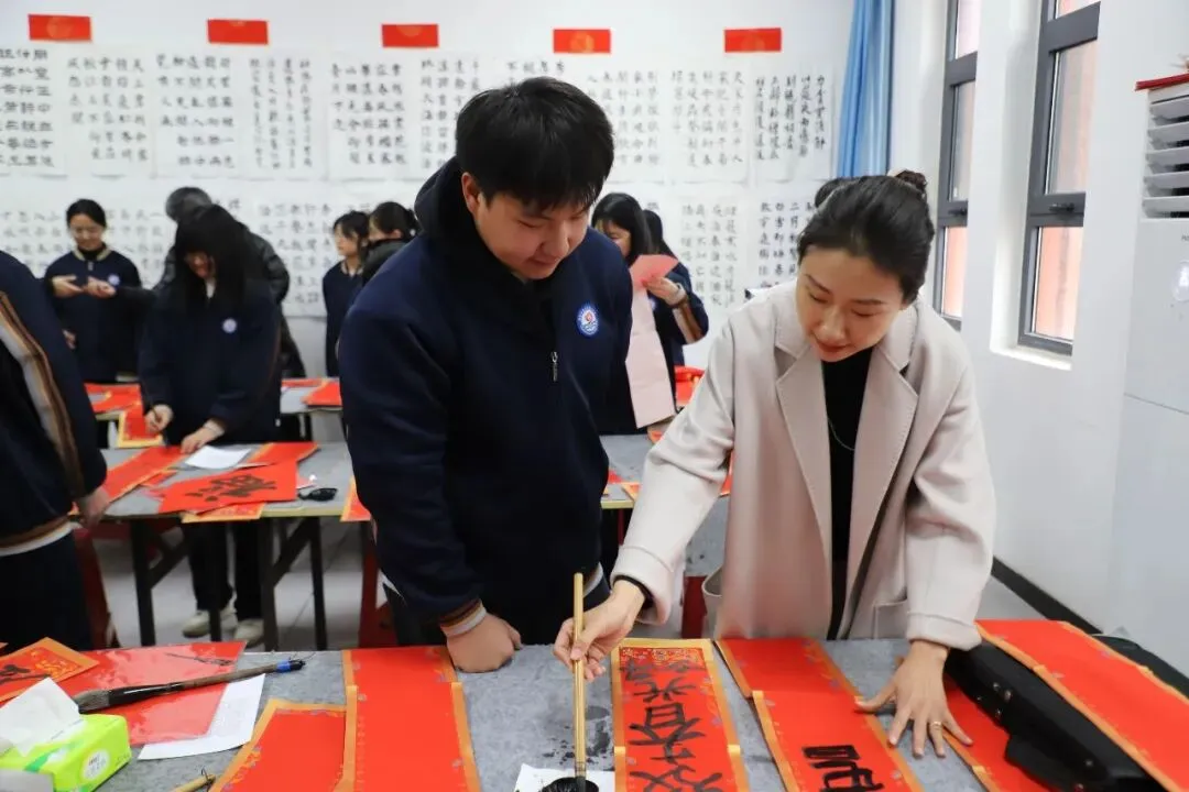 最为温馨的是写春联、送“福”字环节。老师们挥毫泼墨,“龙腾盛世千家喜,马跃神州万里春”等一副副寓意吉祥、笔力遒劲的春联跃然纸上。同学们也大胆尝试,在老师指导下书写属于自己的新春祝福。