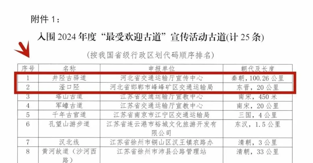 其中,河北有2条分别是井陉古驿道和滏口径。