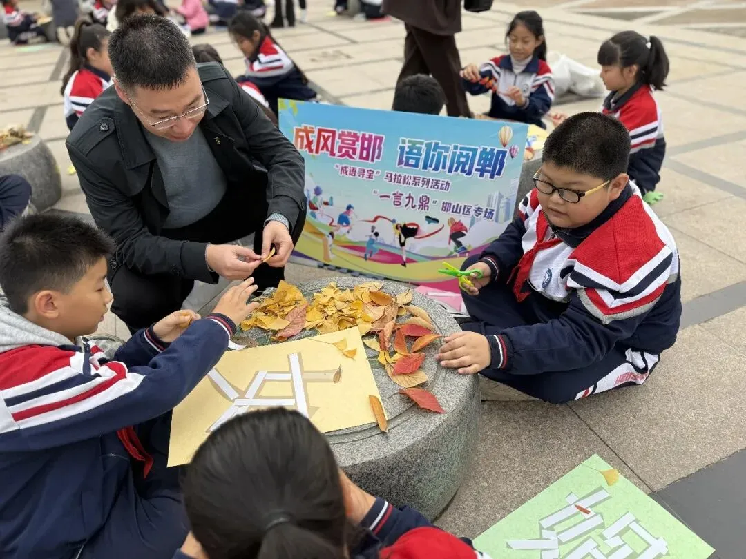 孩子们手中提着袋子,兴奋地穿梭在林间小道,寻找、观察着每一片树叶的形状、颜色和纹理,仿佛在与大自然进行一场亲密的对话。经过他们的构思、设计、拼贴,耗时一个多小时,孩子们拼出了“完璧归赵”“奉公守法”“胡服骑射”“女娲补天”“惊弓之鸟”“纸上谈兵”等十多个出自邯郸的成语典故。