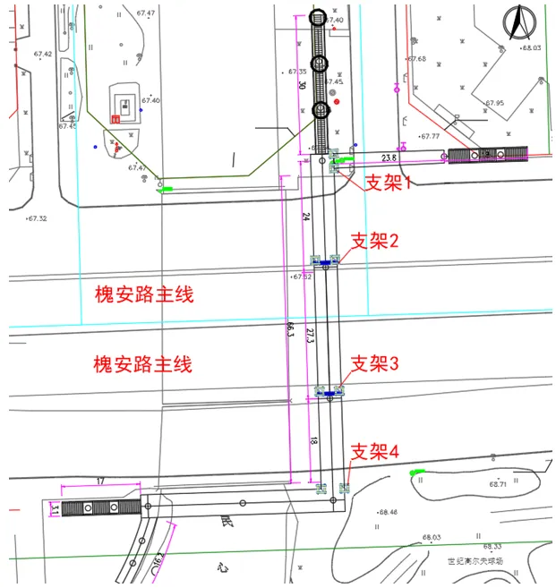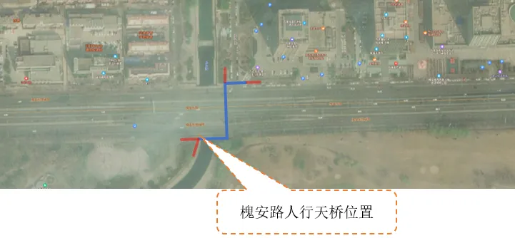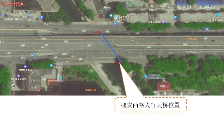 槐安西路过街天桥:主桥全长约 68.5m,主桥净宽 3m,为两跨连续钢箱梁桥,主梁高 1.3m,横跨槐安西路。