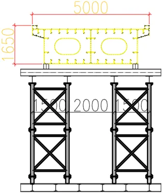 钢箱梁吊装前,需先搭设临时支架作为支撑,以槐安东路天桥为例,支架设计标准严格:支架共设 4 组,高 5m,由下至上依次为 2×6m 路基箱、1.5×1.5m标准节支架、400×200 H 型钢分配梁、300×300 H 型钢垫梁、φ219 圆管支撑。支架与路基箱、分配梁之间用调节管调整高度,顶部与下垫梁满焊,并加设 100×100×12mm 加筋板加强节点;底部与路基箱焊接,每个支腿同样加设 4 块加筋板,焊脚尺寸不小于 6mm。