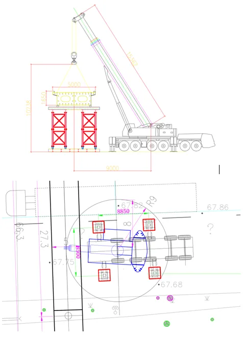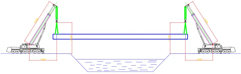3GL组成整体梁段后,重量为127.68t,为本项目最重吊装分段,采用双机抬吊的方式进行安装,最大作业半径为12m,双机抬吊需要计算0.8的不平衡系数,则双机抬吊每台吊重为(127.68/2)/0.8=79.8t。吊装关键步骤:节段运输至现场后,先检查吊耳、钢丝绳、卸扣等吊具安全性。吊耳采用 Q345 钢板,对称设置在箱体主隔板上方,钢丝绳选用 6*37 纤维绳芯规格,抗拉强度 1870MPa,卸扣匹配最大吊装荷载需求。吊车起吊时,先将节段吊离地面 1m 左右,检查受力平衡,再缓慢转动吊臂,将节段吊运至临时支架上方 5cm 处。