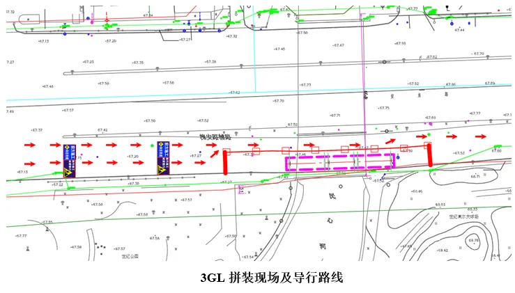 特殊路段导行:以槐安东路天桥 3GL 节段吊装为例,该节段需在槐安路南侧辅路拼装,施工时封闭辅路,设置 “向左改道” 警示牌,安排专人引导车辆;1GL-1 节段吊装需封闭华清南街,因道路狭窄无法导行,提前发布公告引导居民绕行。
