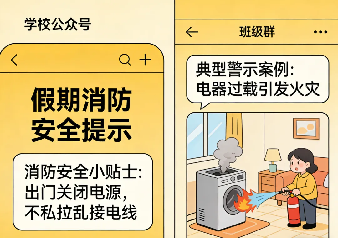 学校放假前要发放致家长一封信,开学前组织全体教职员工开展消防安全培训及实战演练,确保会报警、会组织引导疏散、会扑救初起火灾。假期通过学校公众号、班级微信群等平台,定期推送消防安全小贴士、典型警示案例,常态化敲响安全警钟,让防火安全意识深入人心。