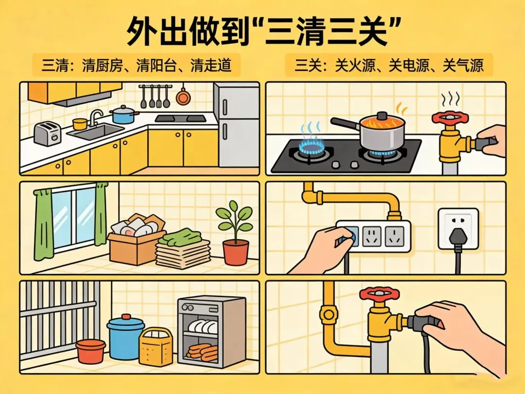 注意家庭用火用电用气安全,厨房用火不离人,用毕及时关闭燃气灶具及管道阀门;使用取暖器设备时远离易燃可燃物,做到人走电断;外出做到“三清三关”,即:清厨房、清阳台、清走道,关火源、关电源、关气源。严禁在疏散通道堆放杂物,杜绝电动自行车“进楼入户”“人车同屋”“飞线充电”等危险行为。
