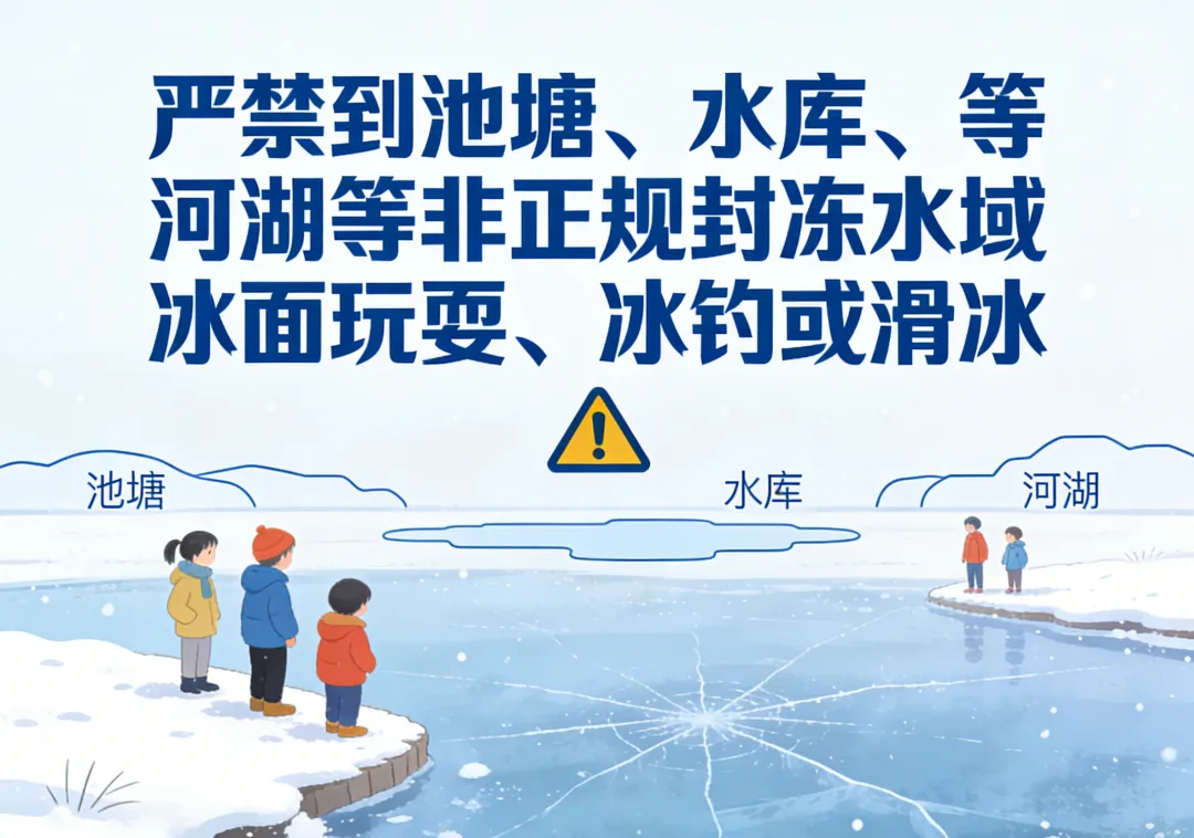 冰上游玩需选择配备防护设施的正规场所,佩戴必要防护用具,儿童滑冰时须有成人全程守护;严禁到池塘、水库、河湖等非正规封冻水域冰面玩耍、冰钓或滑冰。若发现他人落水或坠入冰窟,未成年人切勿盲目下水施救,应立即大声呼救并拨打报警电话,等待专业救援力量。