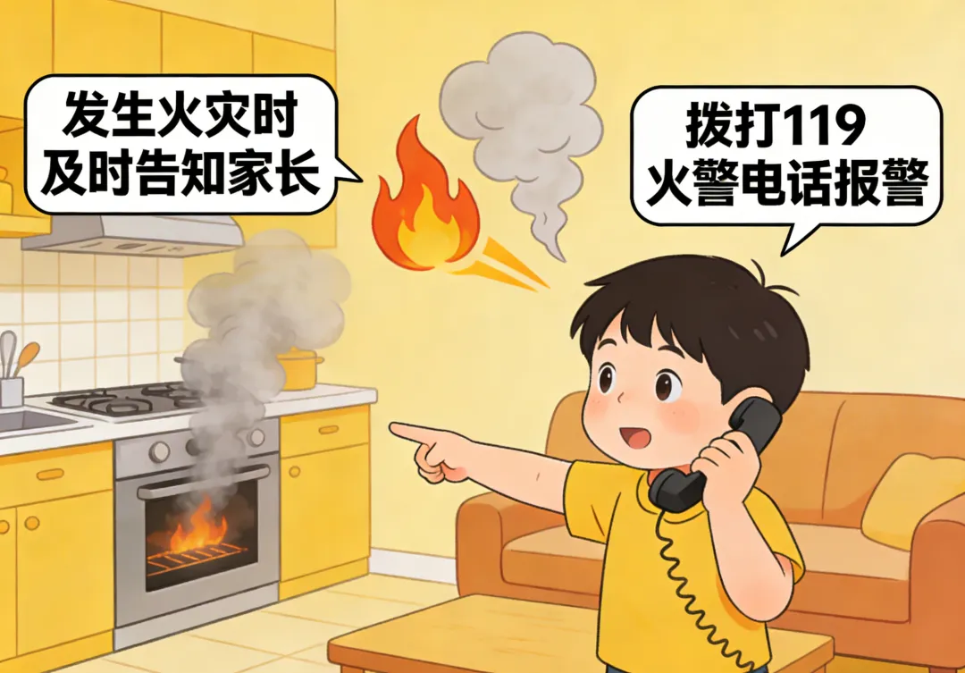 发生火灾时保持沉着冷静,沿疏散通道、楼梯有序逃生,切勿贪恋财物、乘坐电梯,迅速撤离至安全区域后,及时告知家长或拨打“119”火警电话报警。报警时清晰说明火灾地址、起火部位、燃烧物质、火势大小、有无人员被困及联系方式,必要时到路口引导消防车抵达。