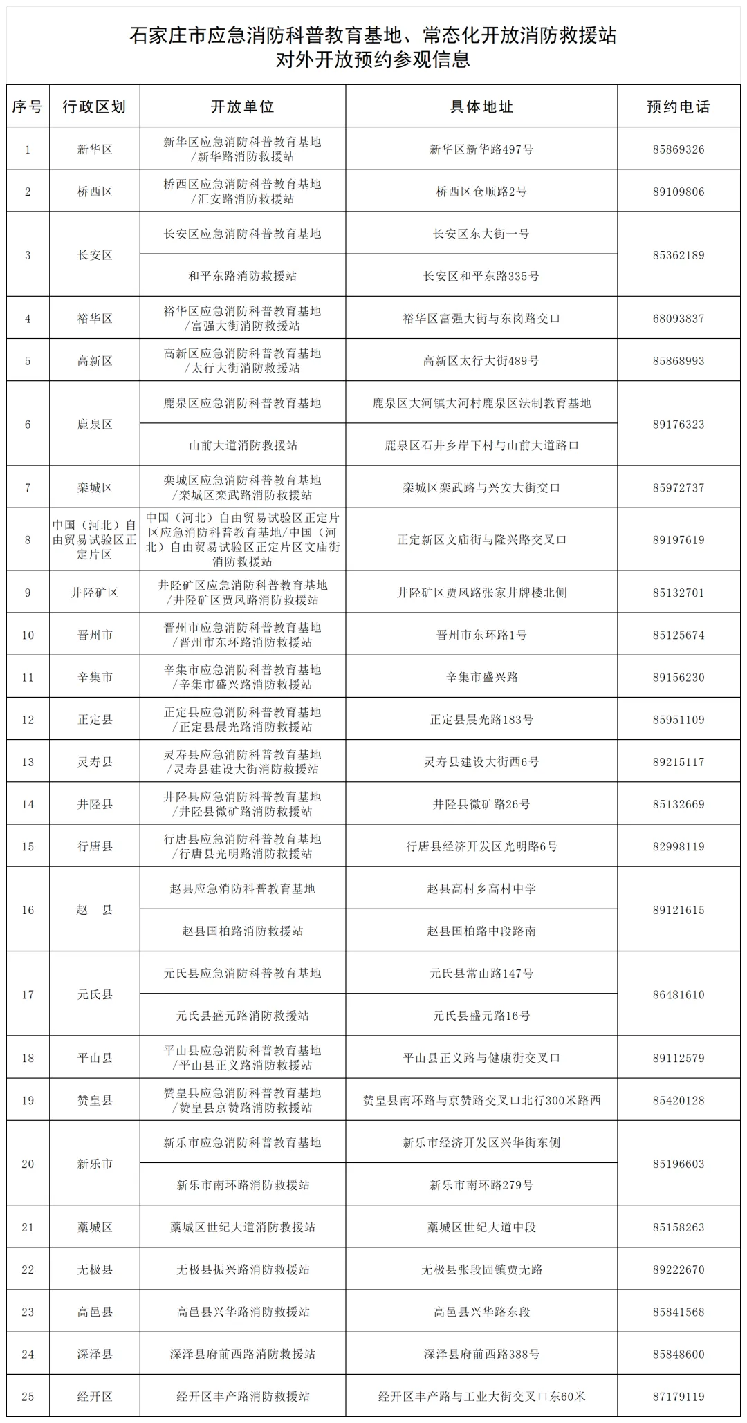 欢迎广大师生、家长利用假期走进石家庄市消防科普教育基地及常态化开放消防救援站,开启免费消防知识探秘之旅,沉浸式学习消防知识,提升安全防护能力。(具体开放地址及预约电话见下图)