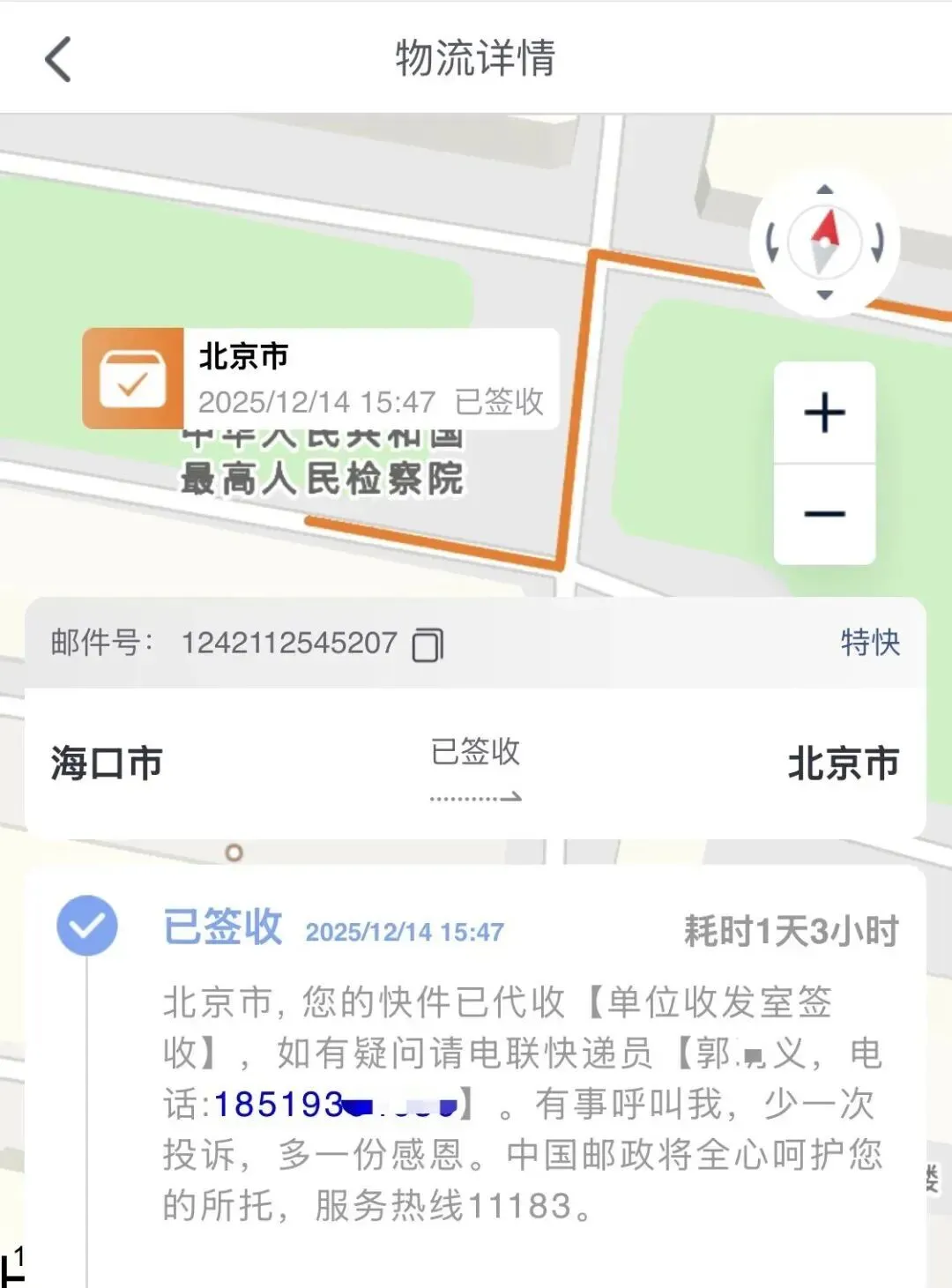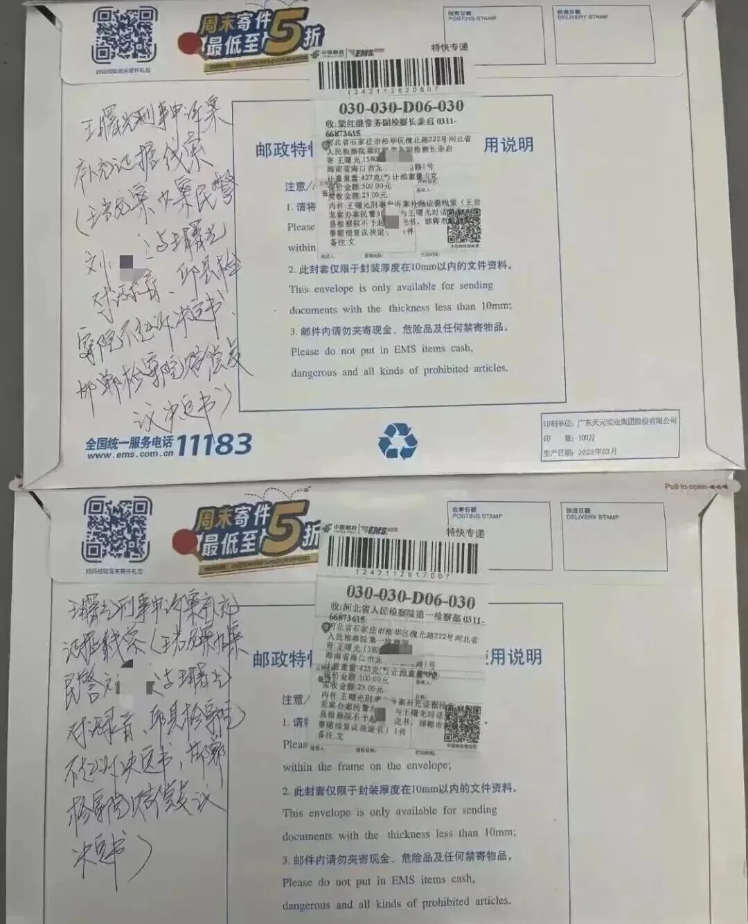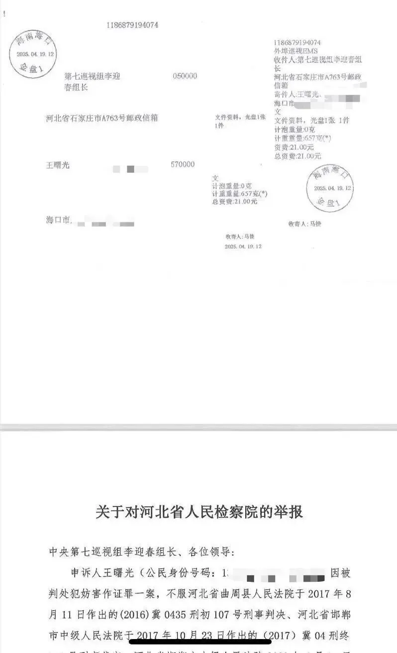 ▲2025.6.23收到邯郸中院邮寄的补正法律文书复印件(中央巡视组督办)▲2025.6.23向河北检察院邮寄邯郸中院补正法律文书复印件2025年10月7日、10月12日向最高人民检察院应勇检察长、最高检控告申诉检察厅陈鸷成厅长反映,提出刑事申诉至今仍未收到河北省人民检察院正式受案法律文书通知书。 2025年10月16日010-12309最高检回复说已转河北省人民检察院。