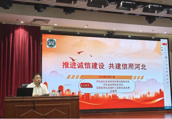 白建军书记作“推进诚信建设 共建信用河北”专题讲座。他讲到,党的十八大以来,党中央、国务院高度重视社会信用体系建设,相继出台多项重要文件。2023年5月,省文明办、省政务办、省信用协会在全省启动“诚信燕赵行”活动以来持续深化推进,本月底还将召开全省深化诚信燕赵行活动推进会。社会信用体系建设意义深远,不仅传承中华民族诚信传统、践行社会主义核心价值观,更是市场经济的基石,对提升社会治理能力、完善国家治理体系至关重要。在企业诚信建设方面,企业诚信是生存发展的基石、凝聚团队的源泉、宝贵的无形资产。