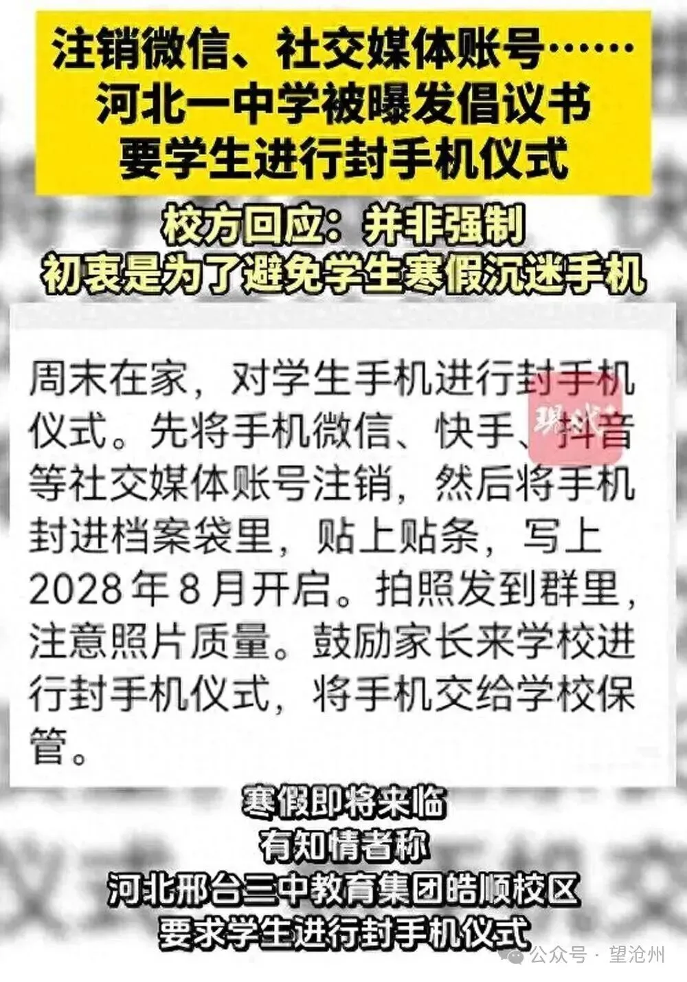 近日,河北邢台三中教育集团皓顺校区一则关于“寒假封手机”的倡议,在网络上引发广泛讨论。