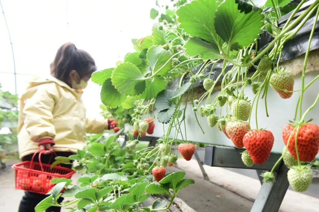 锦田庄园内的草莓大棚,主打新潮的高架立体种植模式,草莓长在“T”型架上,无需弯腰就能轻松采摘,亲子体验感拉满,还有蔬菜采摘、萌宠乐园等丰富内容,吃喝玩乐一站搞定。