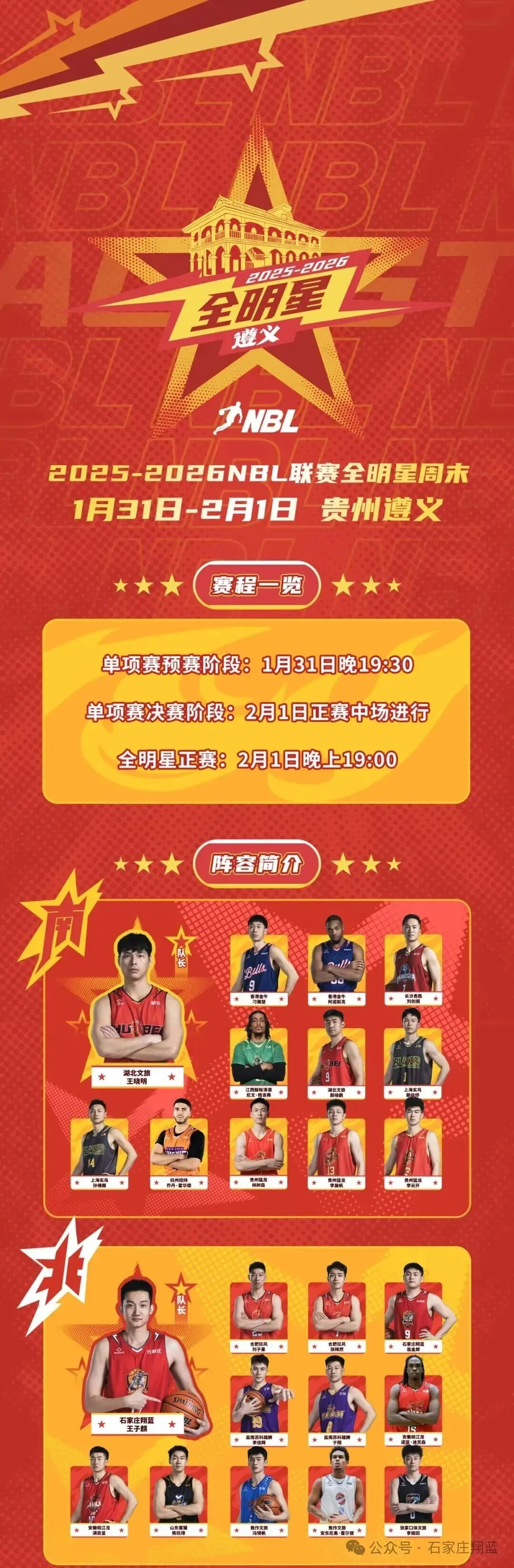 1月31日至2月1日,2025-2026NBL联赛全明星周末将在遵义奥体中心体育馆举行,入选北区代表队的王子麒、翁金郎将参加全明星赛,王子麒和翁金郎还将参加三分大赛,刘德明将参加扣篮大赛。春节之后,全队将重新集合,备战大年初五客场对阵山东蜜獾的比赛。