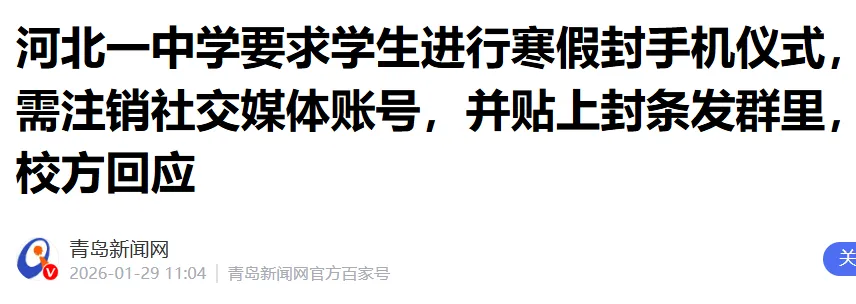 寒假即将来临,邢台三中教育集团皓顺校区举办了一个活动——封手机仪式。据网友称,学校老师要求,学生先将手机里的社交媒体账号注销,再将手机封进档案袋里,贴上封条,写上2028年8月开启。