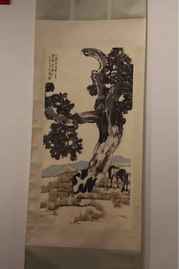 这次展出的《柏树马》,作于1937年,以柏树与马入画,在大师的马题材作品中较为少见。画中,两匹奔放的骏马在苍苍的柏树之下,既画出了了大师对马的独特理解,也展现出了其高超的绘画技艺。