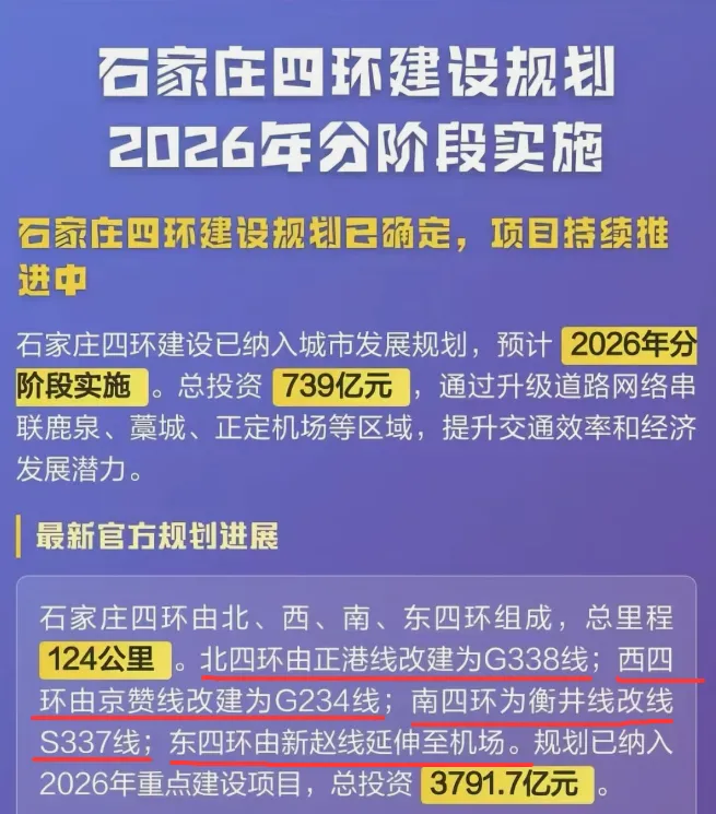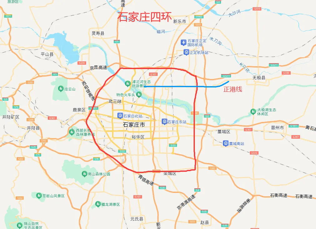 石家庄这几年,持续推进城市更新,交通基础设施建设不断发力,复兴大街,北三环,南二环东延,和平路东延等等,使城市快速路网进一步完善,不断刷新人民群众出行的“幸福指数”。据说在2026年,石家庄四环也开始施工了,咱们看看。石家庄四环在很早以前,就进行过调研以及线路规划,但是一直没有具体线路。这次网上信息显示,四环规划已经确定,将在2026年分段施工。网上信息显示,北四环为正港线改建,南四环有衡井线改建,东四环由新赵线改建,西四环由京赞线改建。改建后,这四条道路组成石家庄的四环路。这样规划的四环路,正定城区位于了四环路之内了,而新三区还是位于四环边上。藁城城区距离最远。以上关于四环的信息,东西南三条道路还比较合适,正港线改北四环,感觉不好实现。正港线向西一过新元高速,就是正定城区了,两侧都是高楼大厦了。既然是四环路,肯定都是快速路,正定城区这一段,肯定不适合了。只能从这里上新元高速,然后向北拐到北绕城上来。与其这样,还不如直接把北绕城改建为北四环呢。然后京昆和青银组成西四环。在建设石家庄四环路之前,四环之内的快速路也有不少需要完善的。石家庄三环路,已经改建完成,特别是北三环高标准改建,成为石家庄最繁忙的一条快速路之一。未来的石家庄城市布局,大概率还是会向东向北发展,所以东部的路网还需要进一步完善。特别是快速路。东部也是石家庄经济产业基地,经开区,高新区,生物医药园区,化工园区等等,都位于东三环附近。随着正定新区的建设,目前总投资超过1000亿了,所以未来正定新区肩负着石家庄都市圈的创新中心,高新技术中心。要使周边的路网更加便捷的通道正定新区。东三环北延,就是关键的一条快速路。正定新区只是和石家庄主城区的交通比较便捷。而东南区域的人们要是正定新区,必须要绕太行大街或者复兴大街。如果东三环能够北延,那么这将会是一条东南区域到正定新区的最快捷的一条道路,也是到正定机场的一条捷径。对于空港区,正定新区,高新区,经开区,生物医药园区,栾城区等联系更加便捷。虽然石家庄未来是拥河发展,但是南部区域也不应该忽视,由于是平原,更好规划建设。东三环南延衡井线,使得栾城区和高新区又增加了一条快速路。而以前的快速路太行大街,作为一条南北主干道。