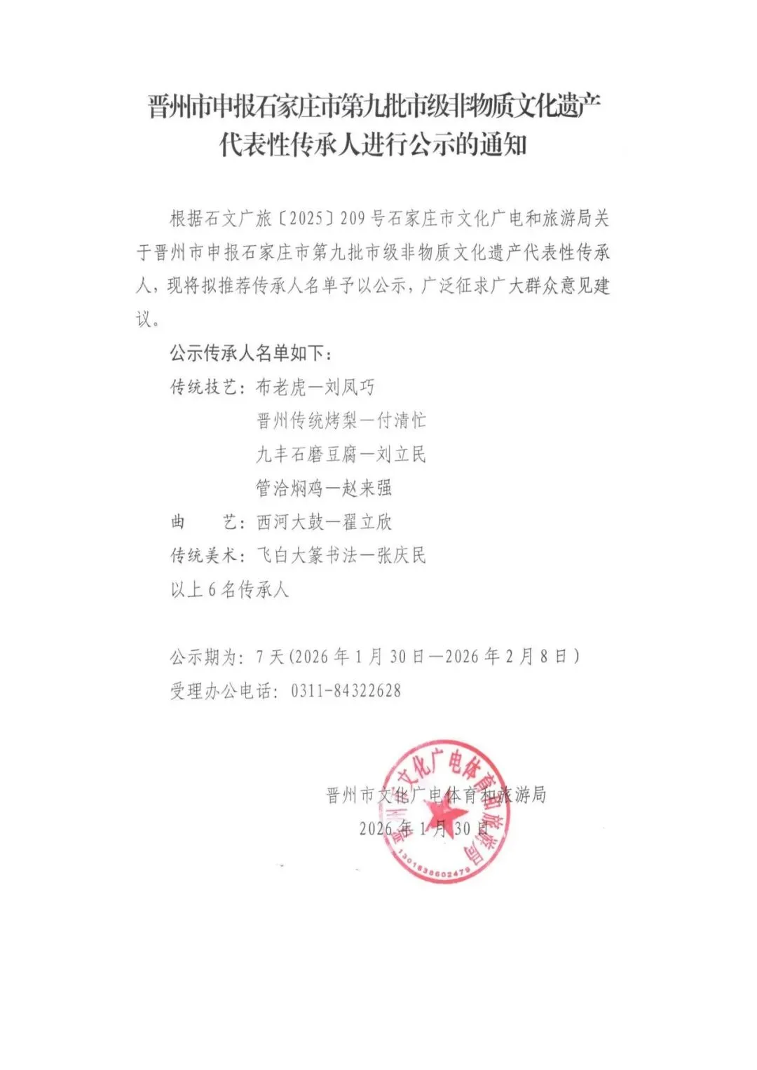晋州市拟推荐申报石家庄市第九批市级非物质文化遗产代表性传承人公示通知