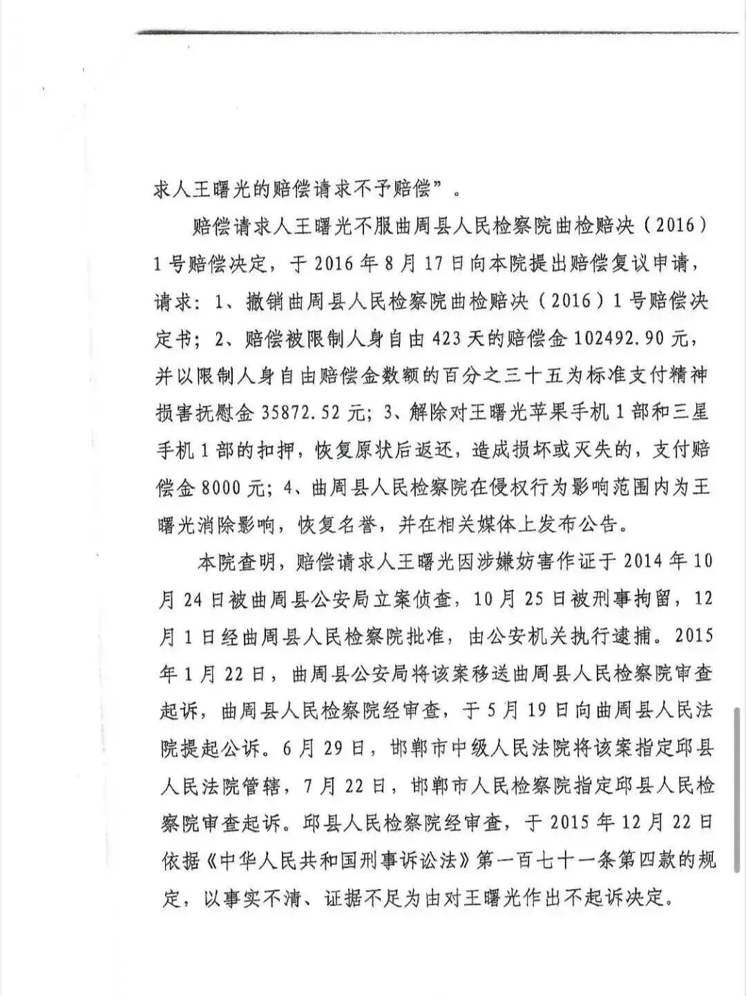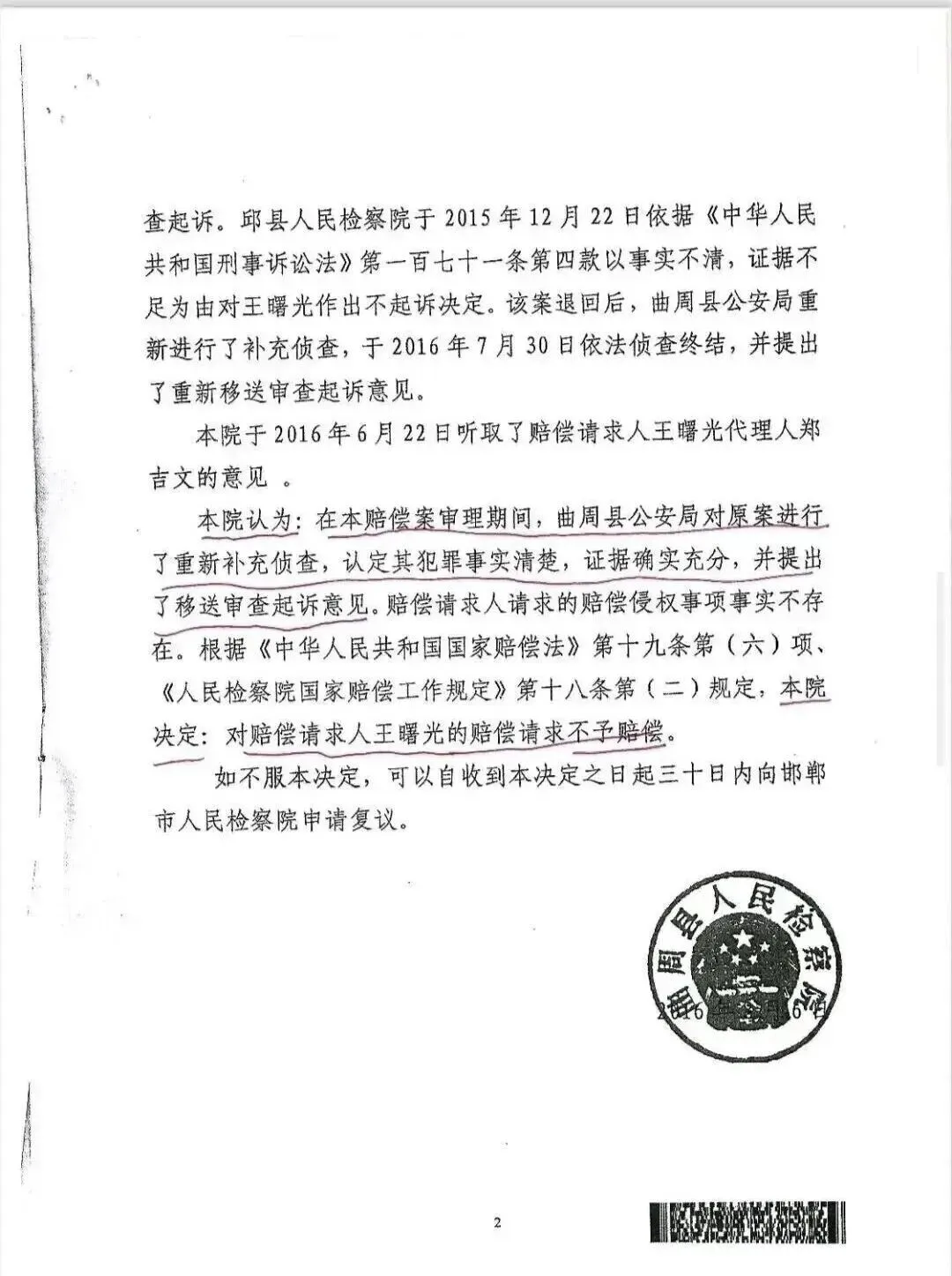 曲周县检察院于2016年6月7日决定受理我提出的国家赔偿申请,并于同年8月6日以“曲周县公安局对原案进行了重新补充侦查,认定其犯罪事实清楚,证据确实充分”作出不予赔偿的决定。