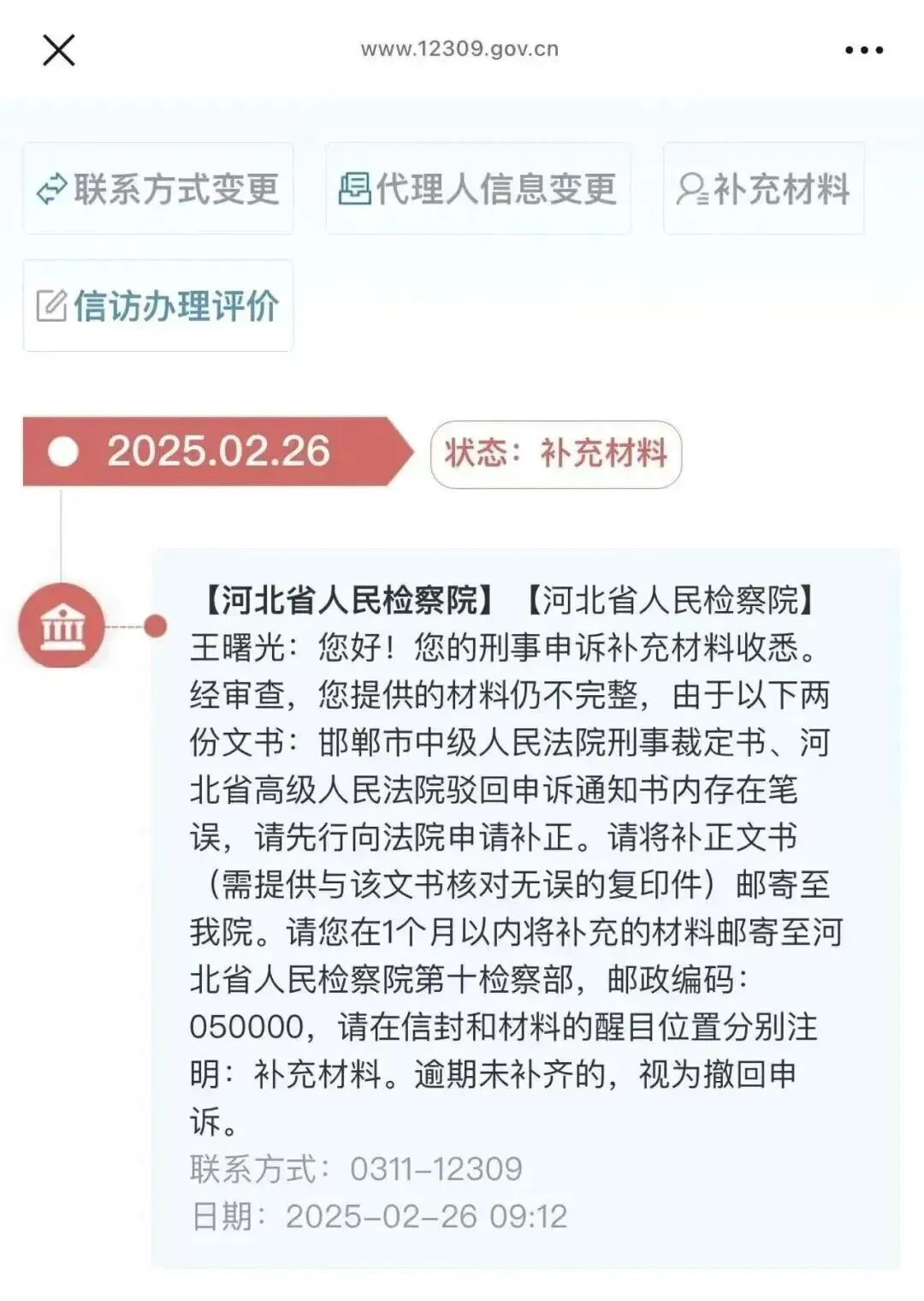 2025年11月21日收到12309短信:【河北省人民检察院】王曙光:您好!最高人民检察院转来您的信访材料收悉。经查,您反映的刑事申诉案件正在办理中,请耐心等待。
