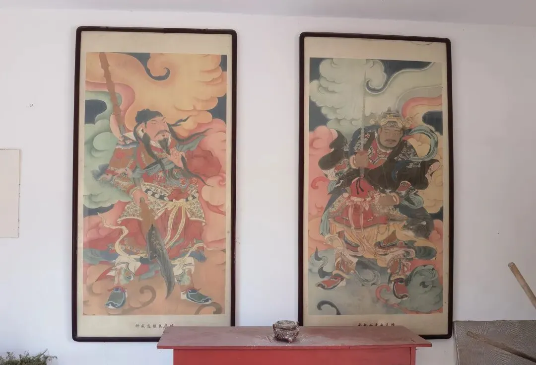 山门西面墙上挂着“关公”和“赵公明”。