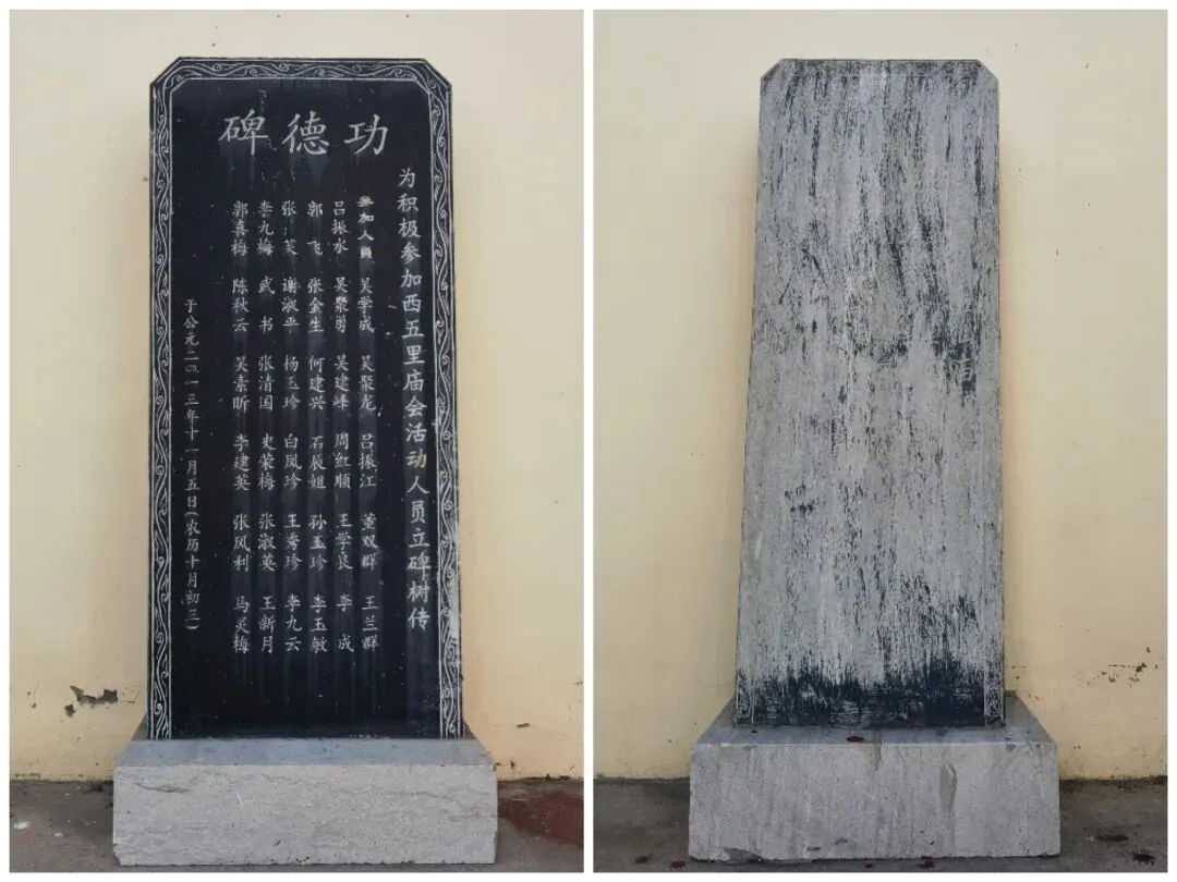 玉皇殿东面墙根立有两通新碑:“改建五仙庙——西五里庄五仙庙积善留名”、“功德碑——为积极参加西五里庙会活动人员立碑树传”。