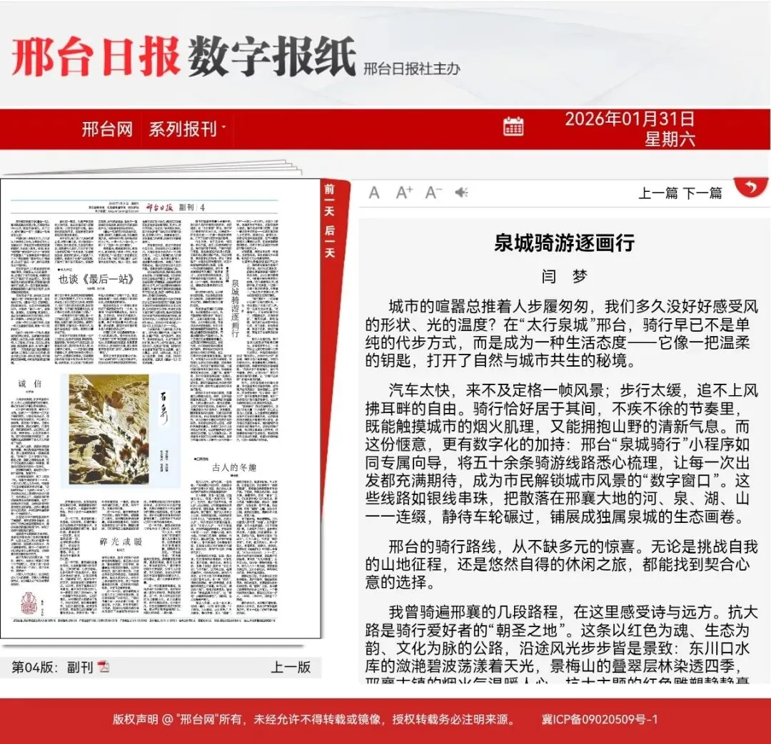 城市的喧嚣总推着人步履匆匆,我们多久没好好感受风的形状、光的温度?在“太行泉城”邢台,骑行早已不是单纯的代步方式,而是成为一种生活态度——它像一把温柔的钥匙,打开了自然与城市共生的秘境。