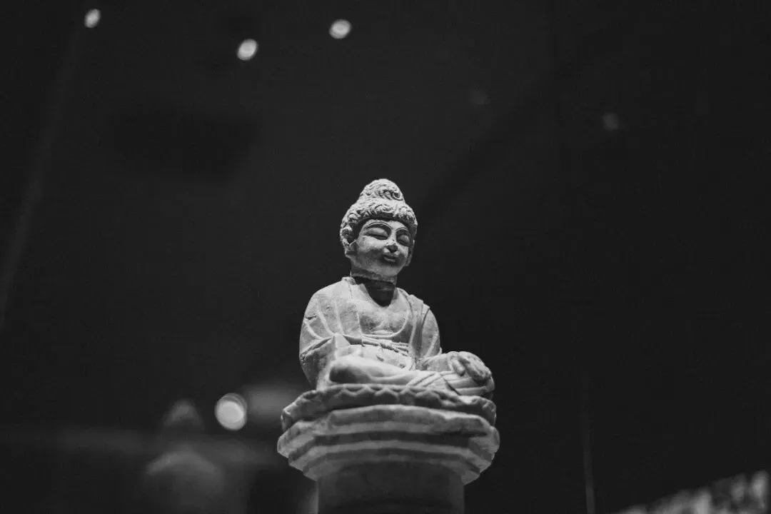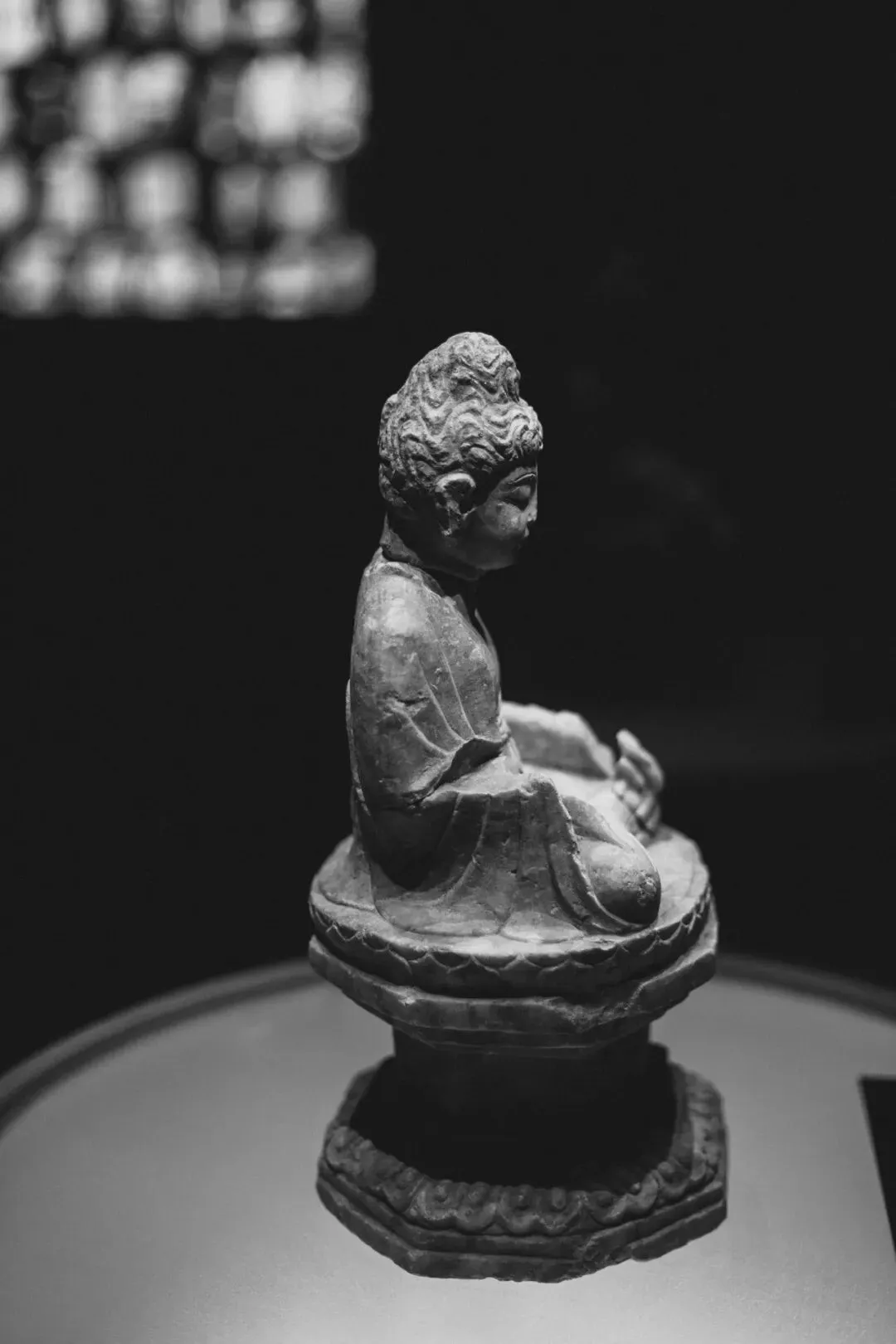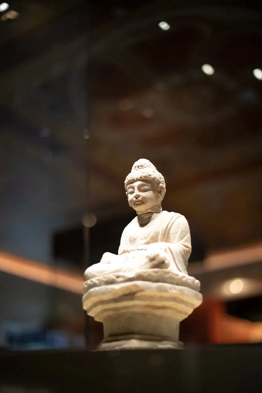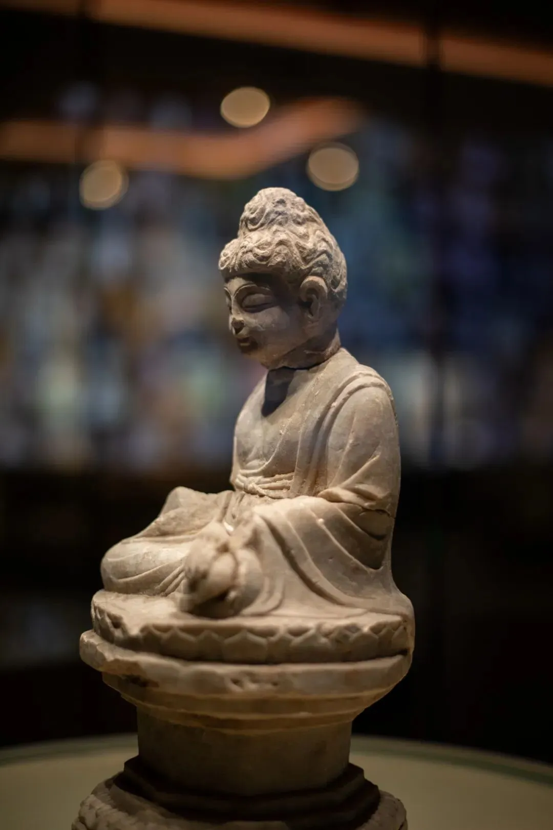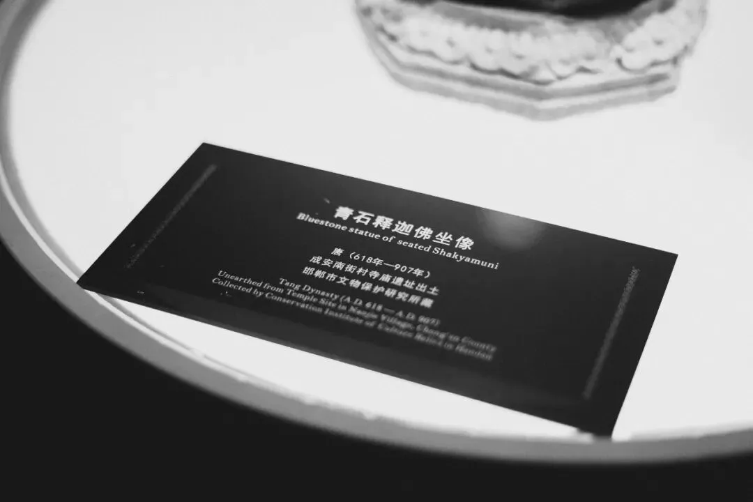 这是唐代的青石释迦佛坐像,它是1997年在成安县南街村的古寺庙遗址中被发现的,如今由邯郸市文物保护研究所收藏,在邯郸博物馆里陈列展出。这尊佛像最动人的地方,就是它低垂的双目和嘴角那抹宁静、含蓄的微笑,这种温柔慈悲的神情,正是典型的唐代造像艺术风格。