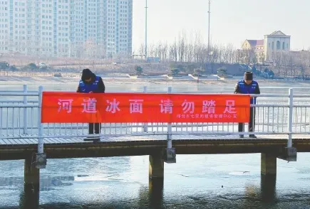 随着寒潮来袭,我市气温持续走低,七里河部分水域已出现结冰现象,也让七里河有了别样韵味,吸引着很多市民和游客前去游玩亲近。但七里河冰面冰层厚度不均、质地脆弱,人员踩踏极易造成冰面破裂,引发溺水危险。
