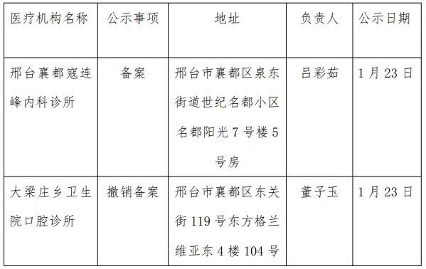 本次公示期限自 2026年1月23日至2026年1月30日。自公示之日起,公民、法人或其他组织如有意见和建议,请在公示期以书面形式向邢台市襄都区卫生健康局提出异议。