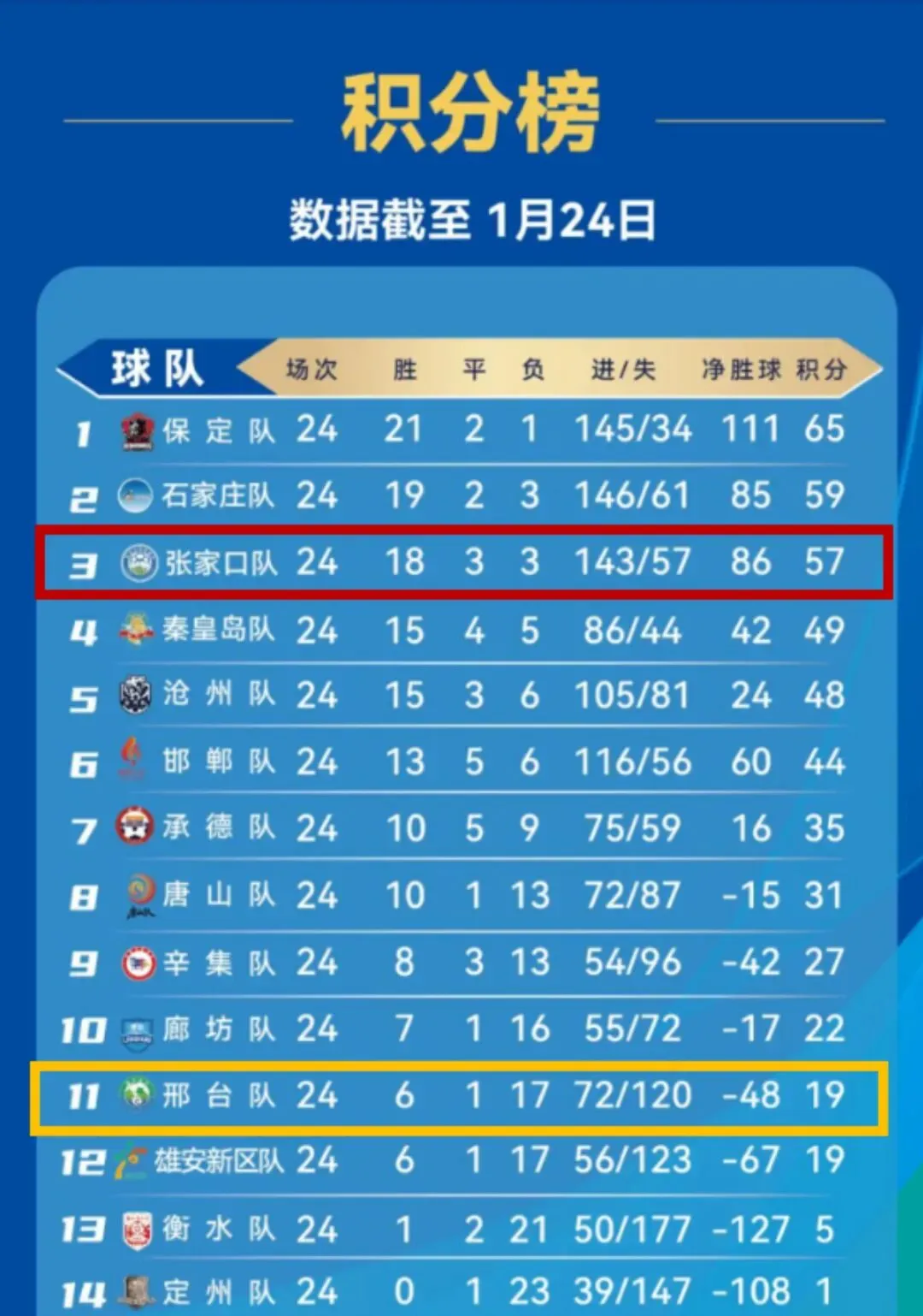 张家口队:18胜3负3平,积57分,