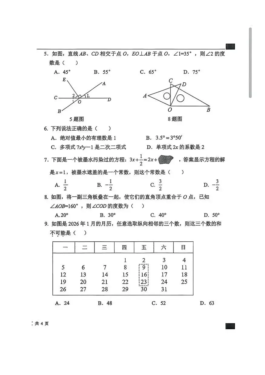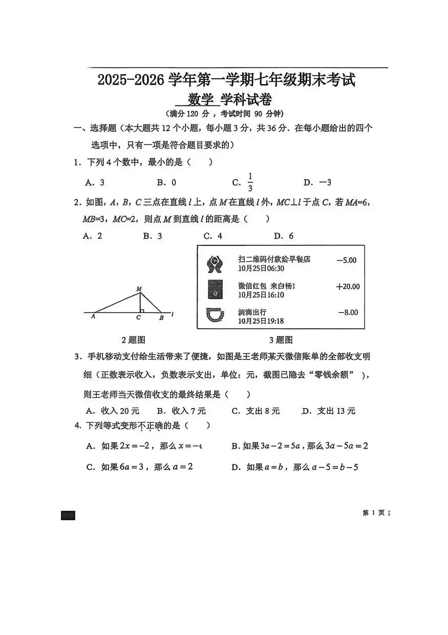 >【初一数学】2026年1月30日石家庄市43中七上期末考试数学卷