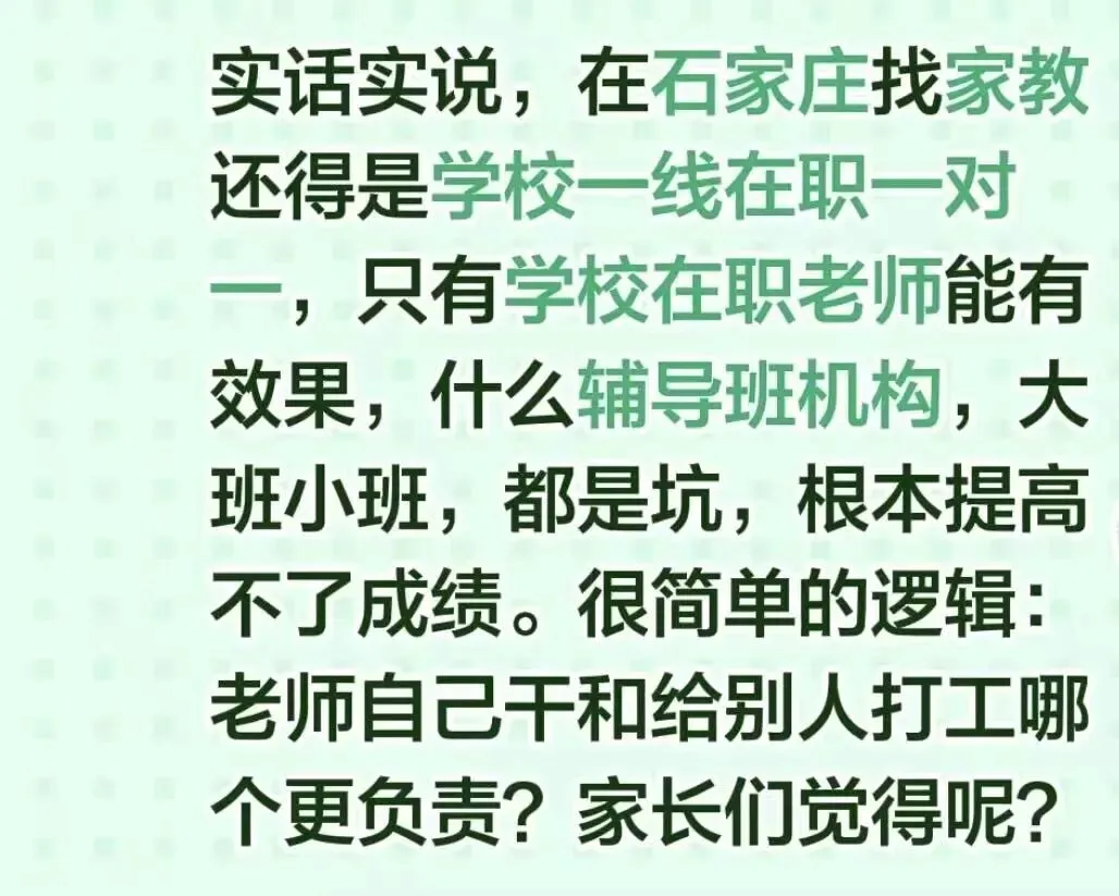 实话实说,在石家庄找家教还得是学校一线在职一对一,只有学校在职老师能有效果,什么辅导班机构,大班小班,都是坑,根本提高不了成绩。很简单的逻辑:老师自己干和给别人打工哪个更负责?家长们觉得呢?