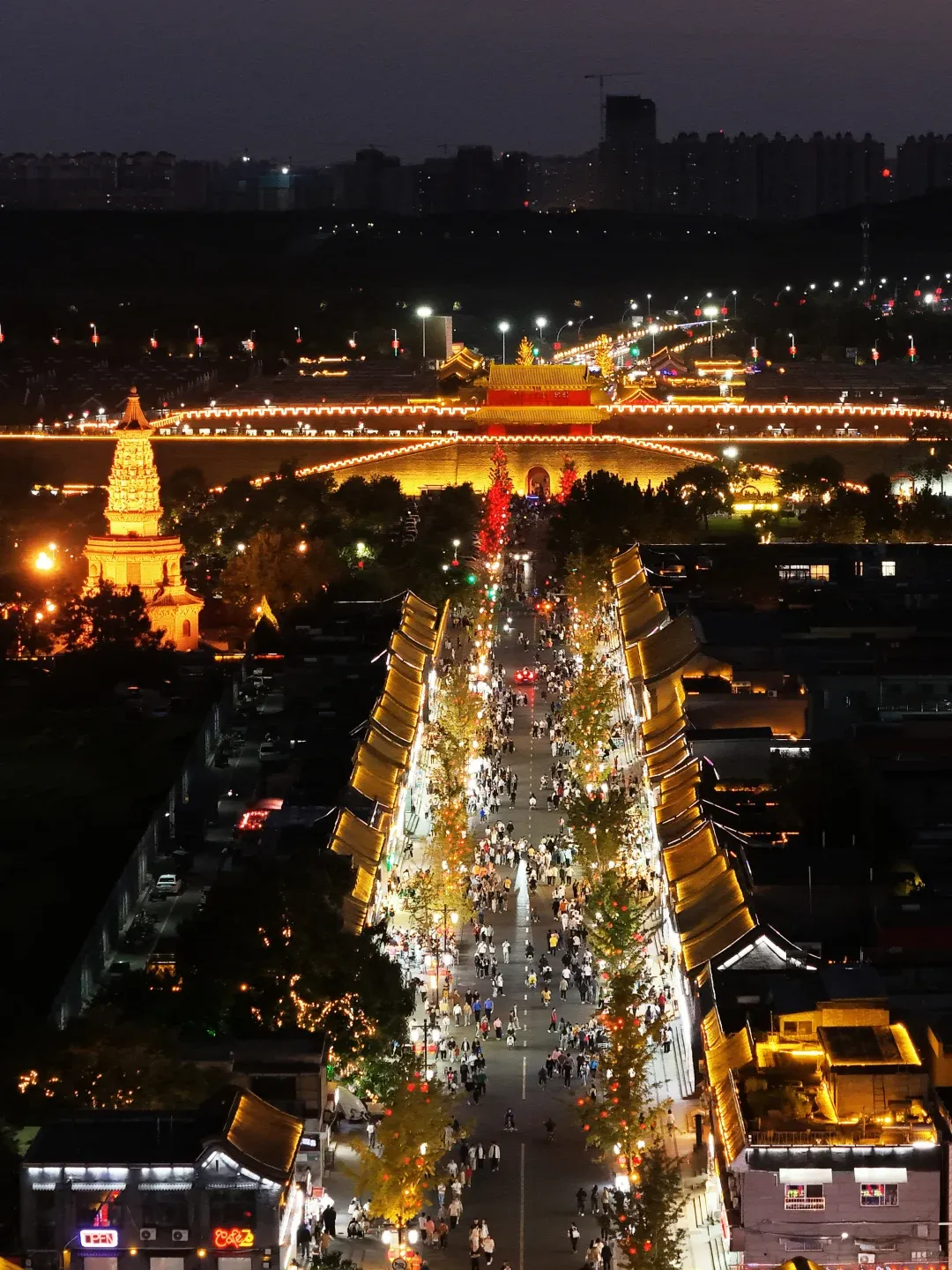 带娃,正定古城里住一晚,夜里走到南门,城墙灯带亮,小孩不闹。